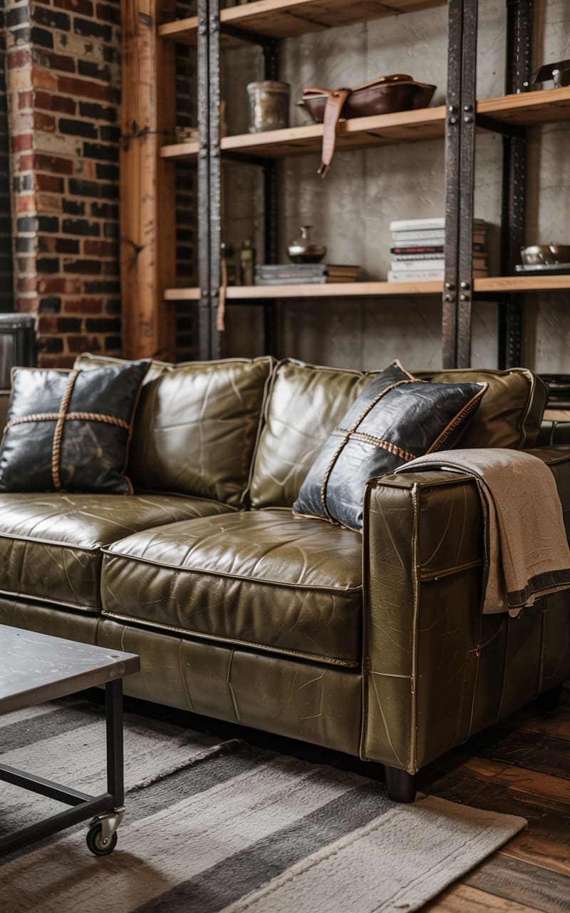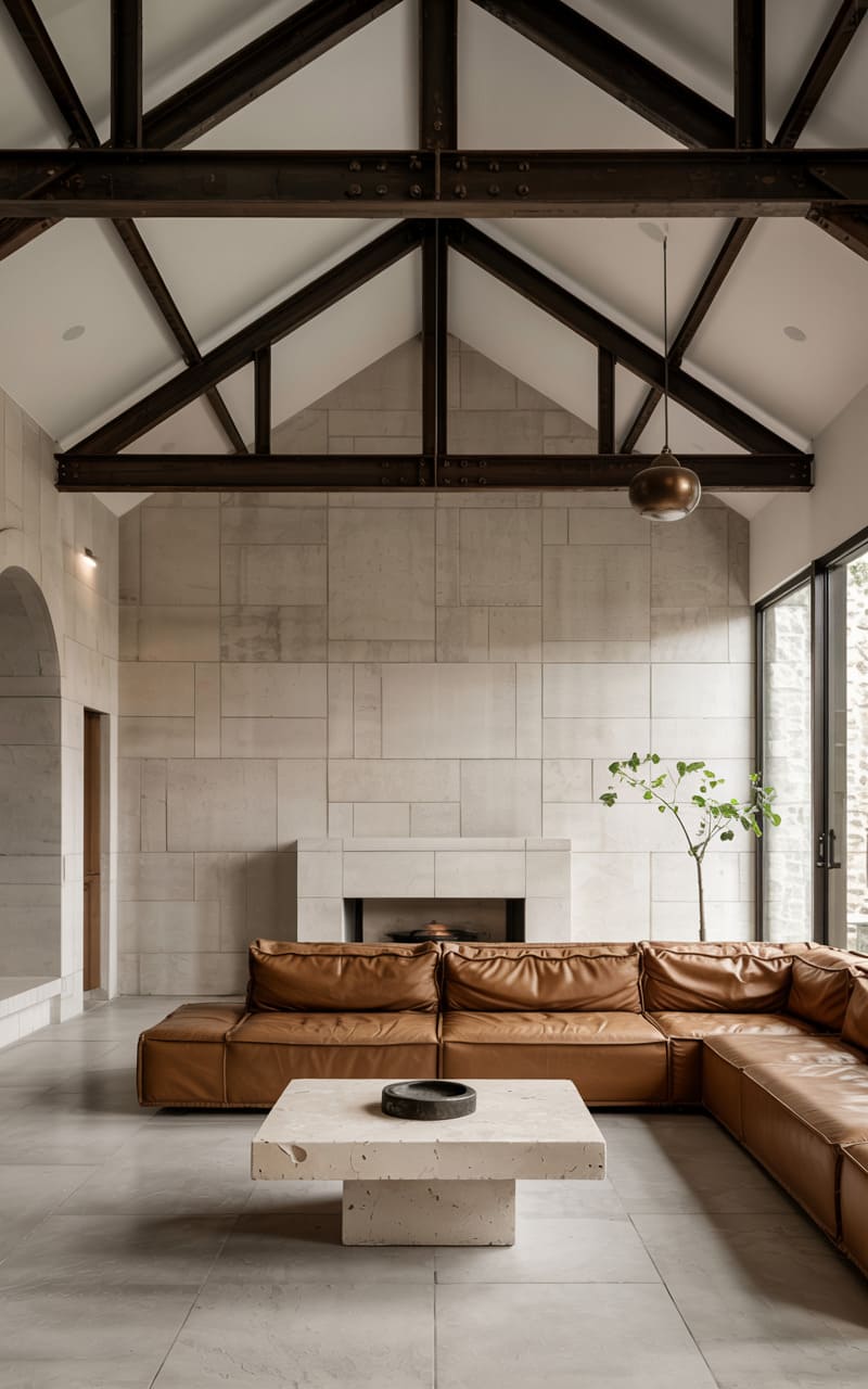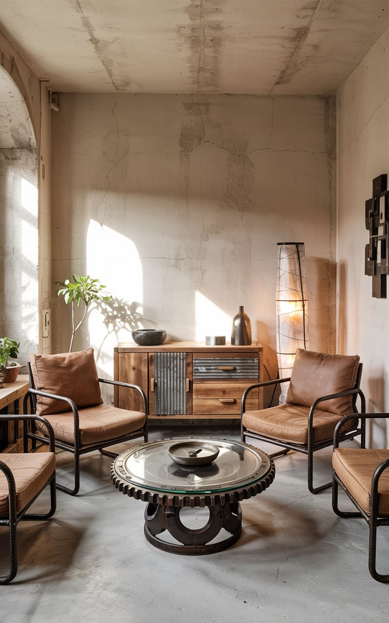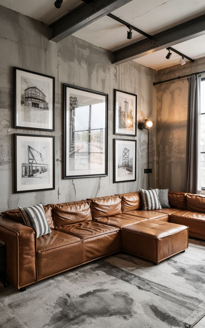 31. Industrial Living Room with Layered Concrete and Aged Leather Textures