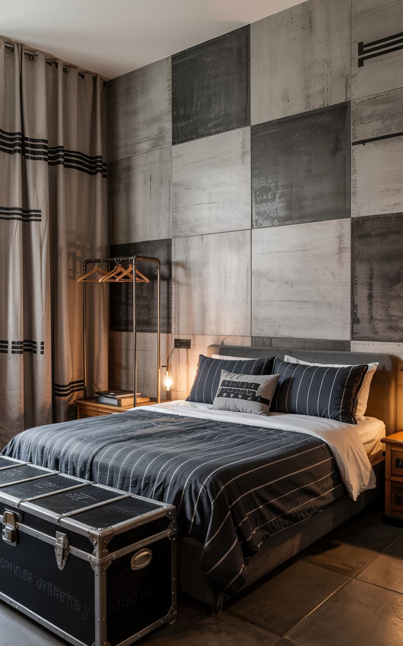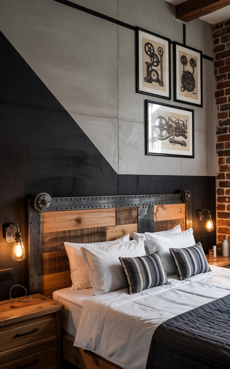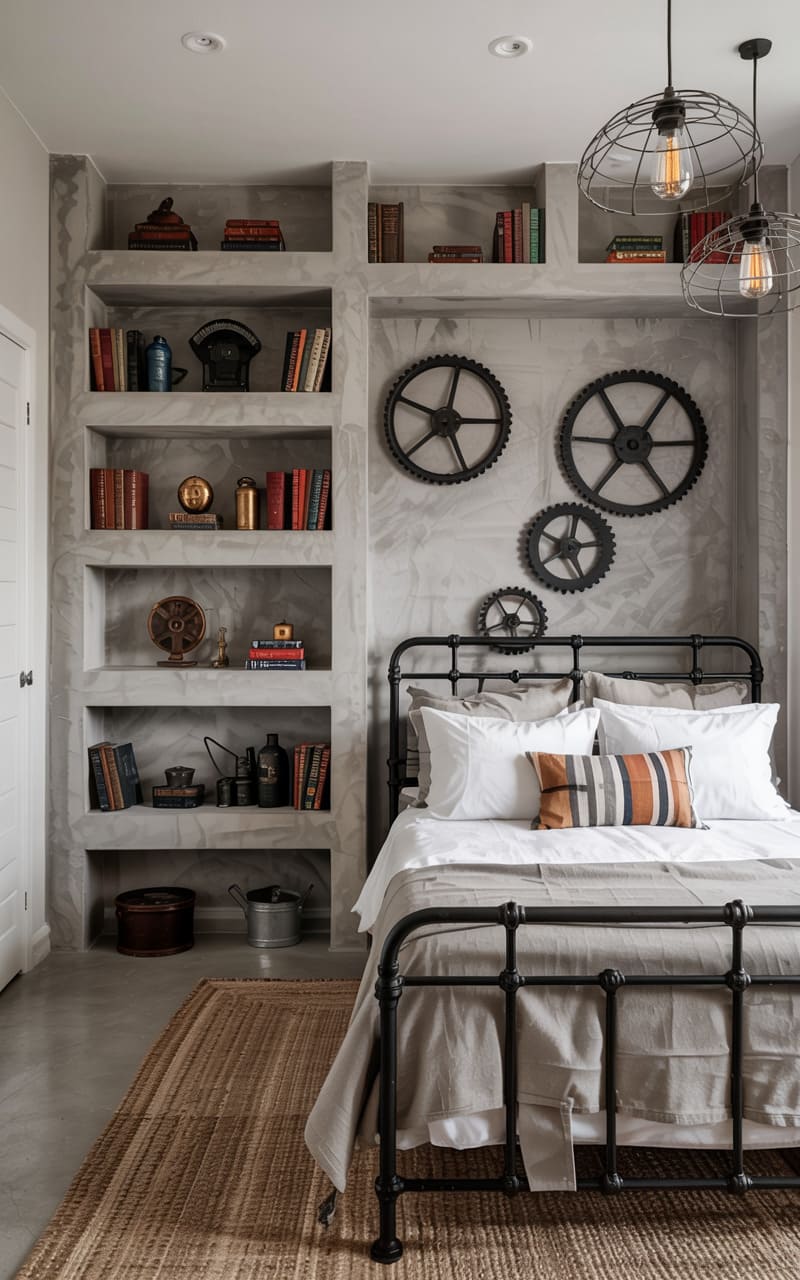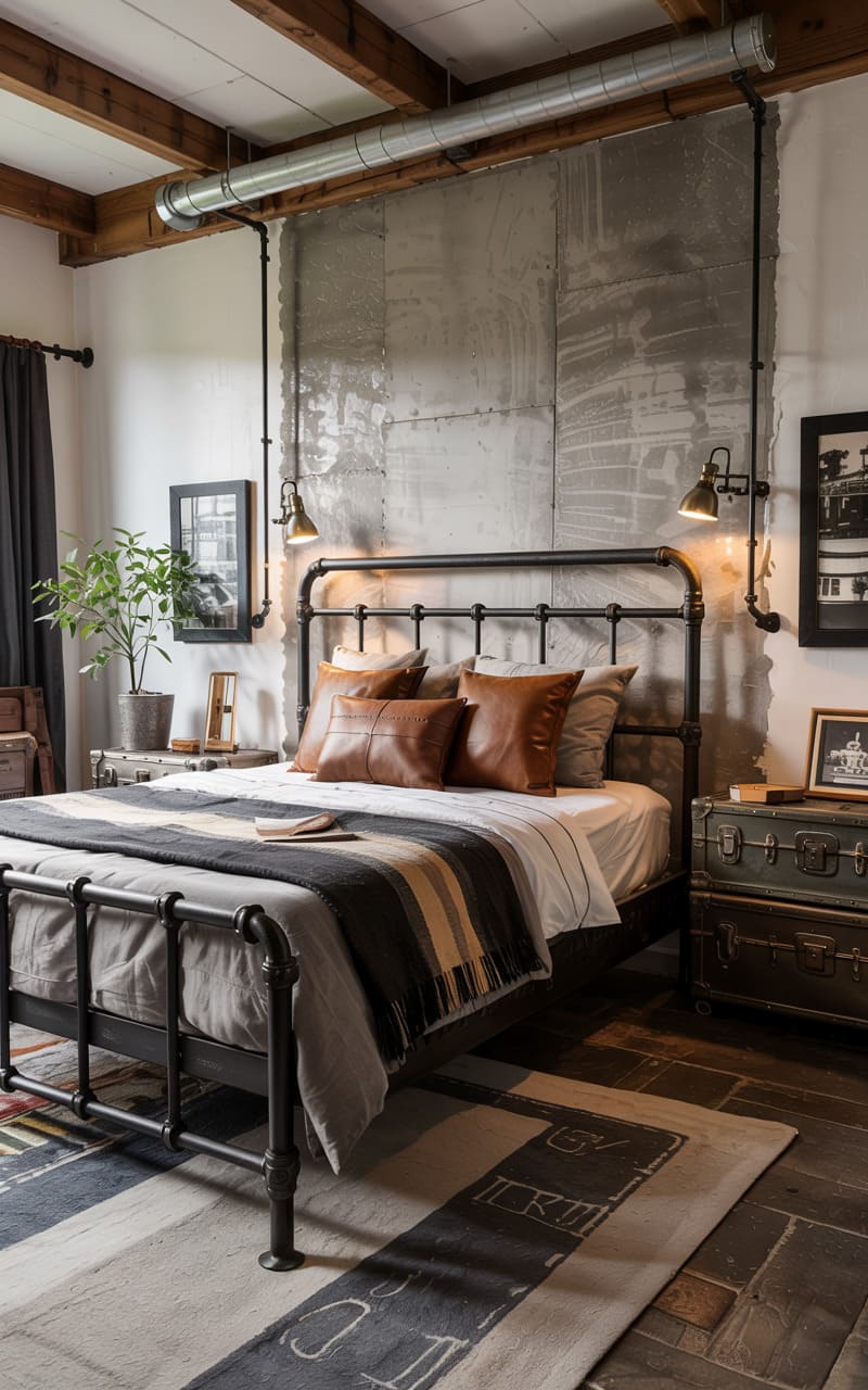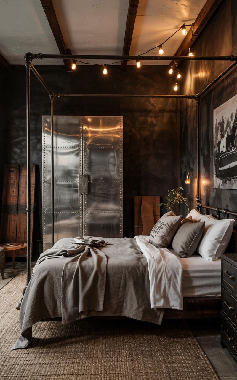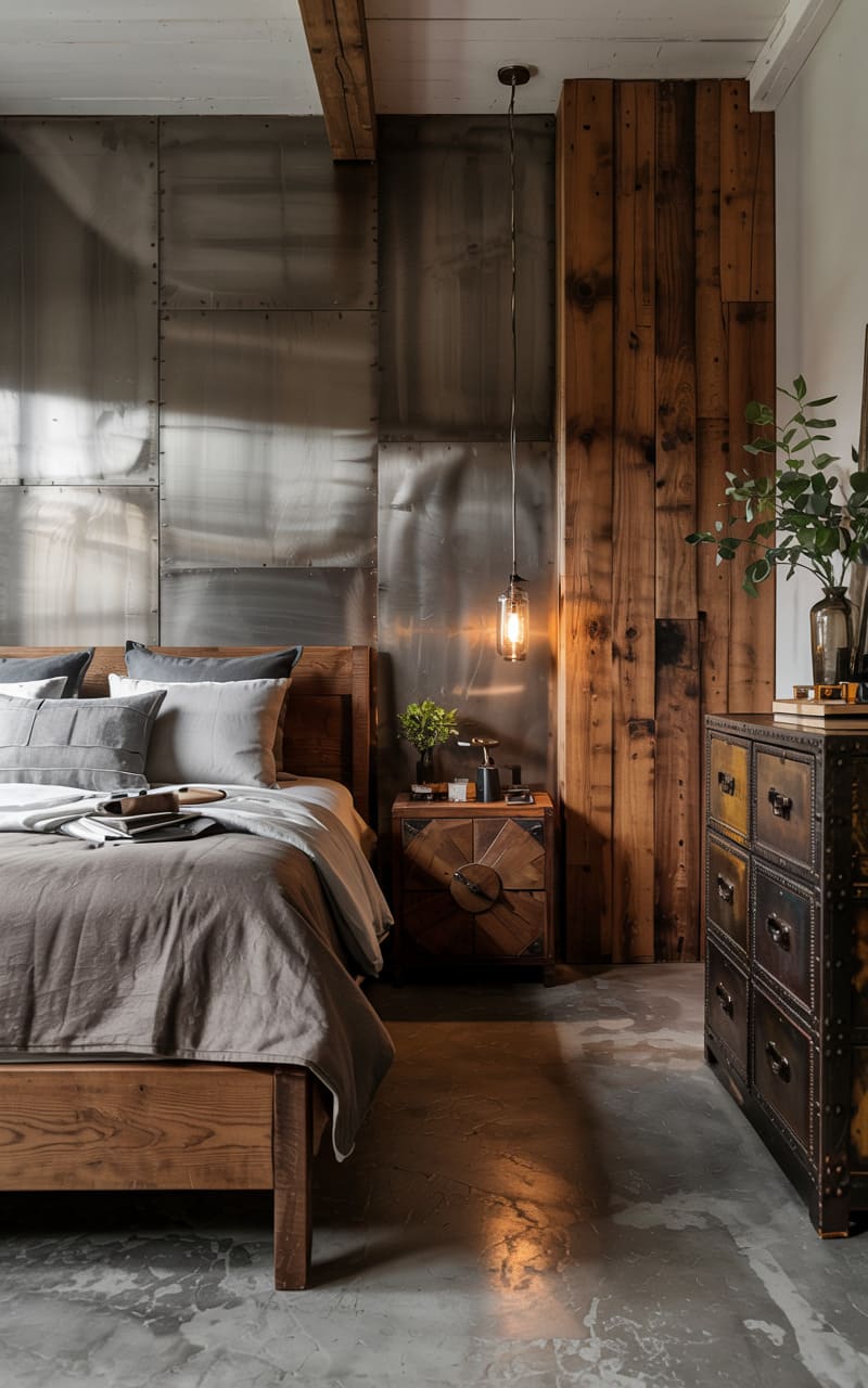 32. Industrial Bedroom with Brushed Metal and Burnished Wood Finishes