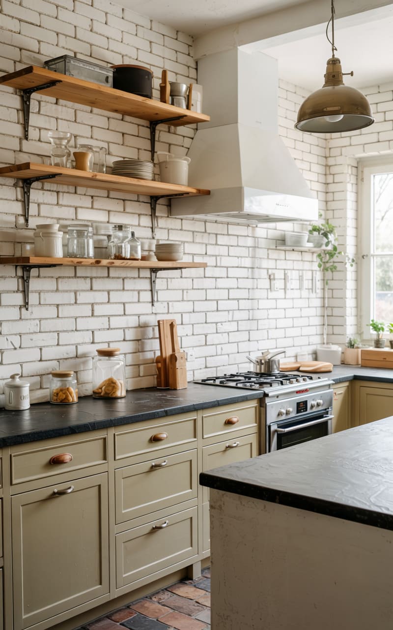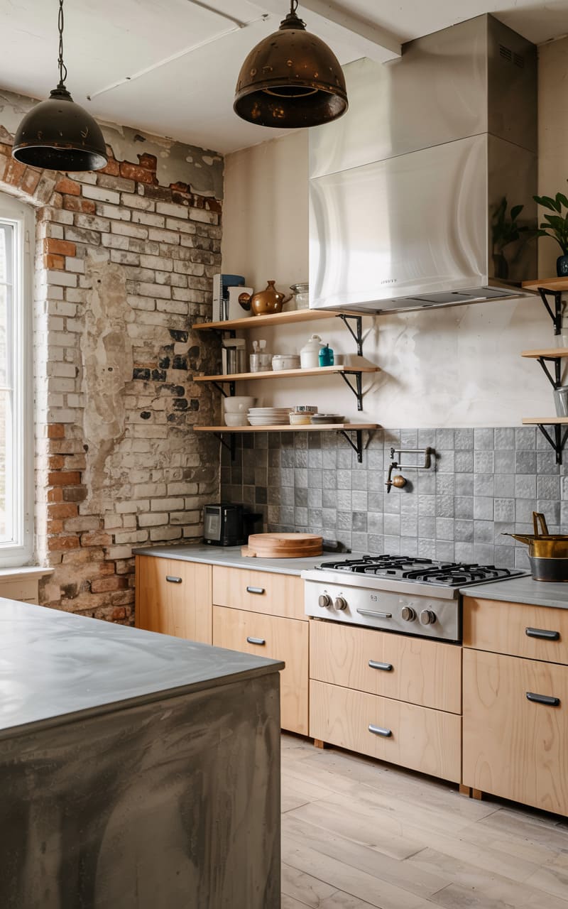 33. Industrial Kitchen with Worn Brick and Polished Concrete