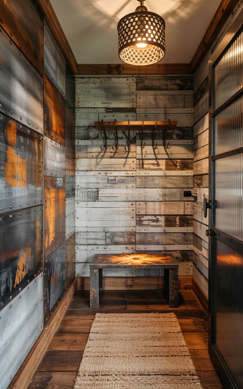 This narrow passageway pulses with a raw, almost elemental energy. Patches of rusted metal, riveted together like a forgotten ship’s hull, line one wall, their tarnished surfaces catching the dim glow of a perforated pendant lamp. Opposite, weathered planks of wood, bleached and striated, suggest years exposed to the elements, while a simple wooden bench and a coarsely woven rug anchor the space in a sense of rustic utility. A fluted glass door, framed in dark metal, hints at a transition to another world, its texture blurring the line between inside and out.