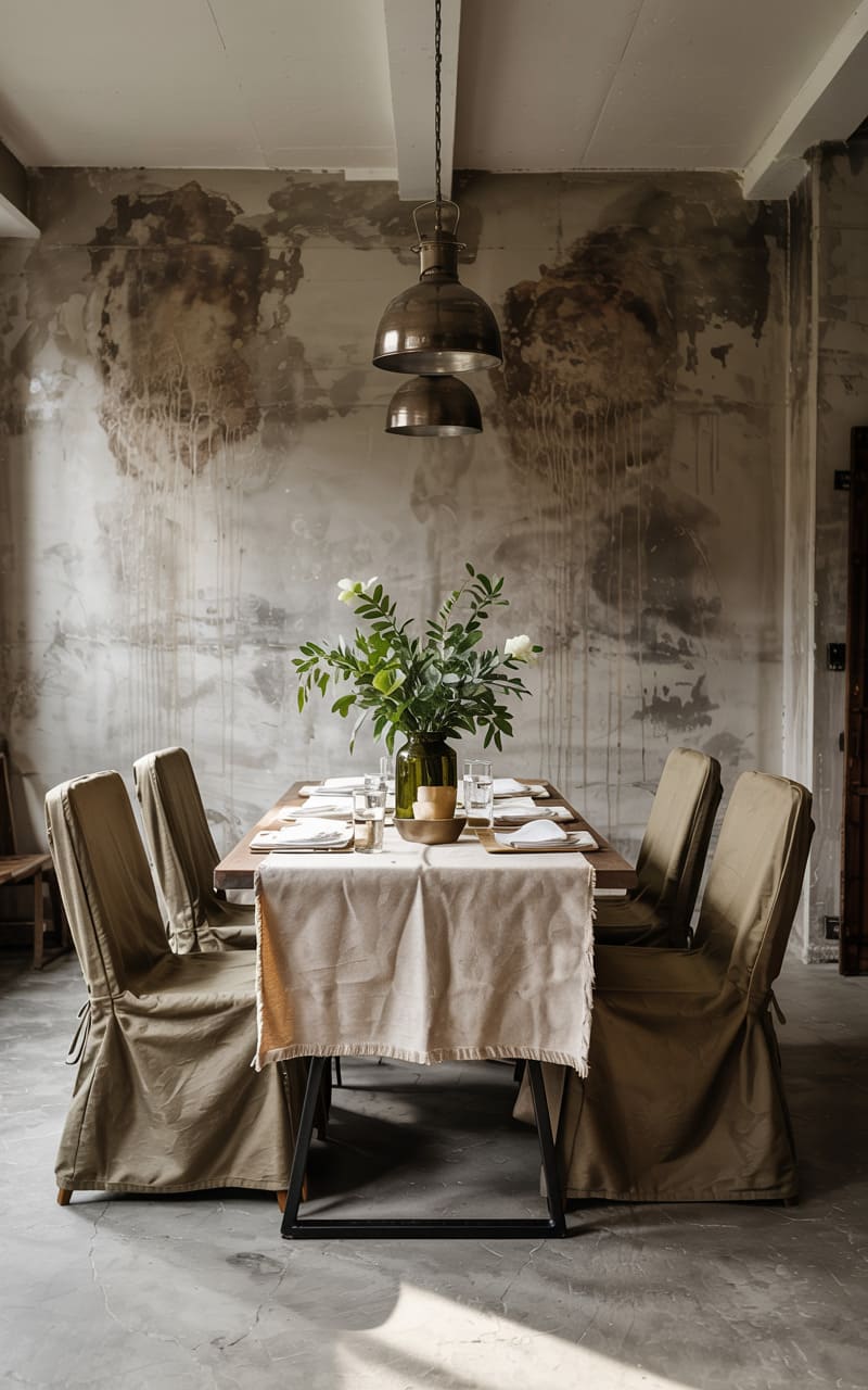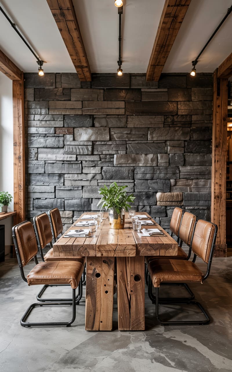 36. Industrial Dining Area with Rough-Cut Stone and Tactile Fabrics