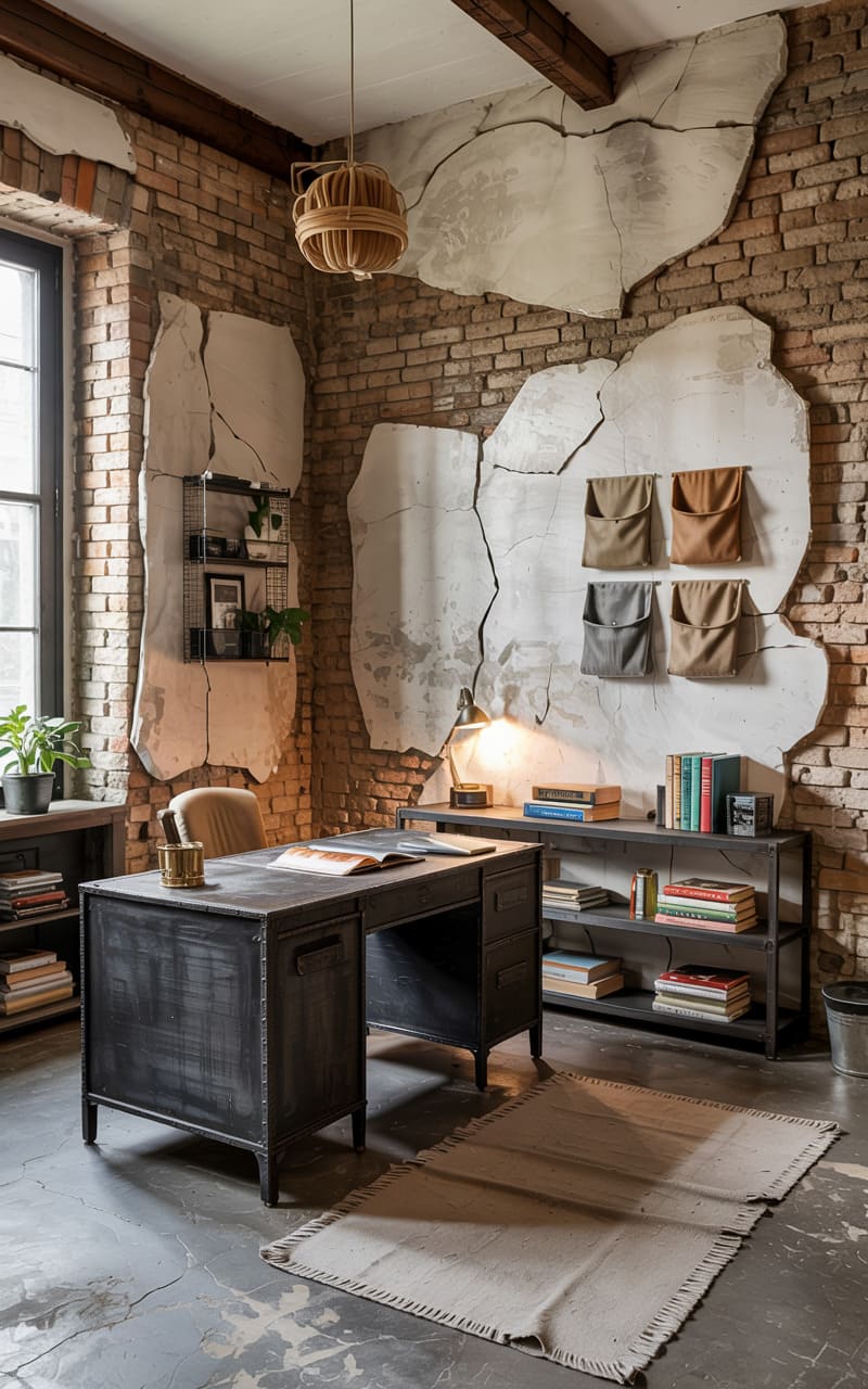 This space vibrates with a raw, almost rebellious energy. A hefty, distressed metal desk anchors the room, its industrial heft contrasting with the soft glow of a table lamp and the warm tones of stacked books. The walls, a patchwork of exposed brick and deliberately fractured plaster, speak of a history left beautifully unfinished, while canvas pouches tacked to the wall add a touch of utilitarian charm. A woven pendant casts a gentle, diffuse light, highlighting the room’s unique blend of ruggedness and quiet sophistication.