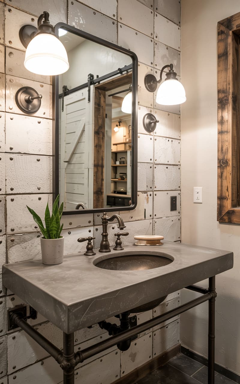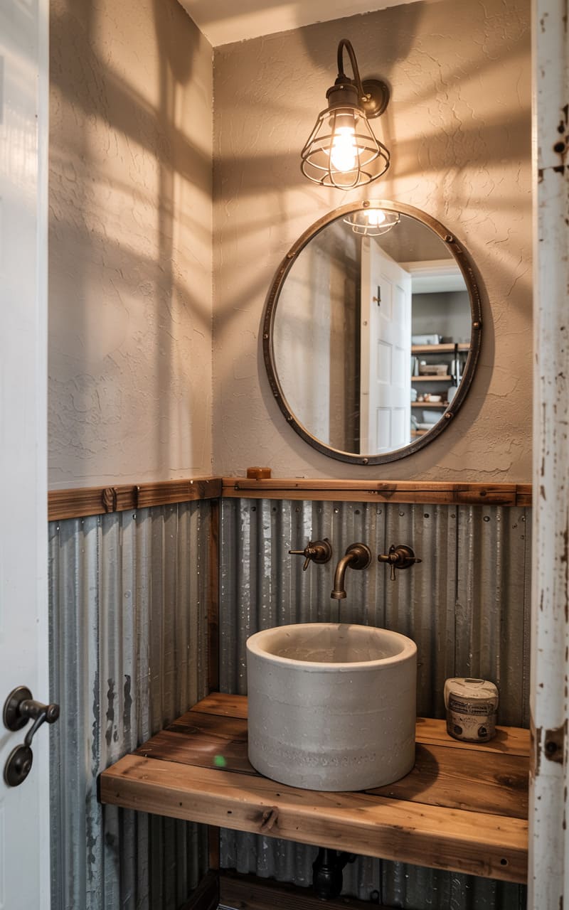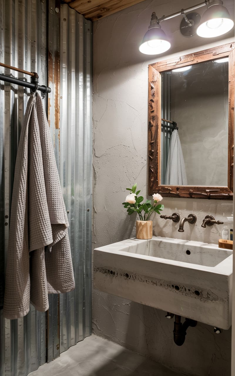 38. Industrial Guest Bathroom with Corrugated Metal and Honed Cement
