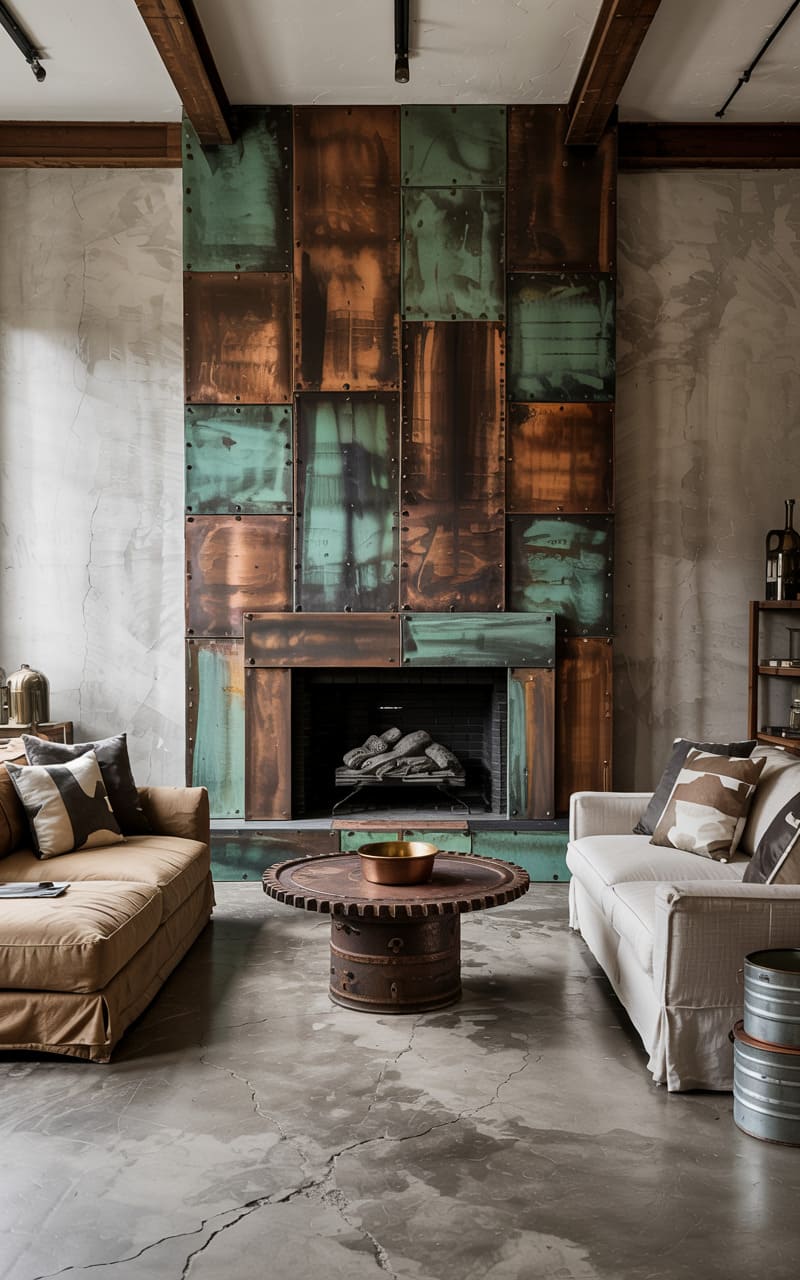 39. Industrial Living Room with Patinated Copper and Cracked Concrete