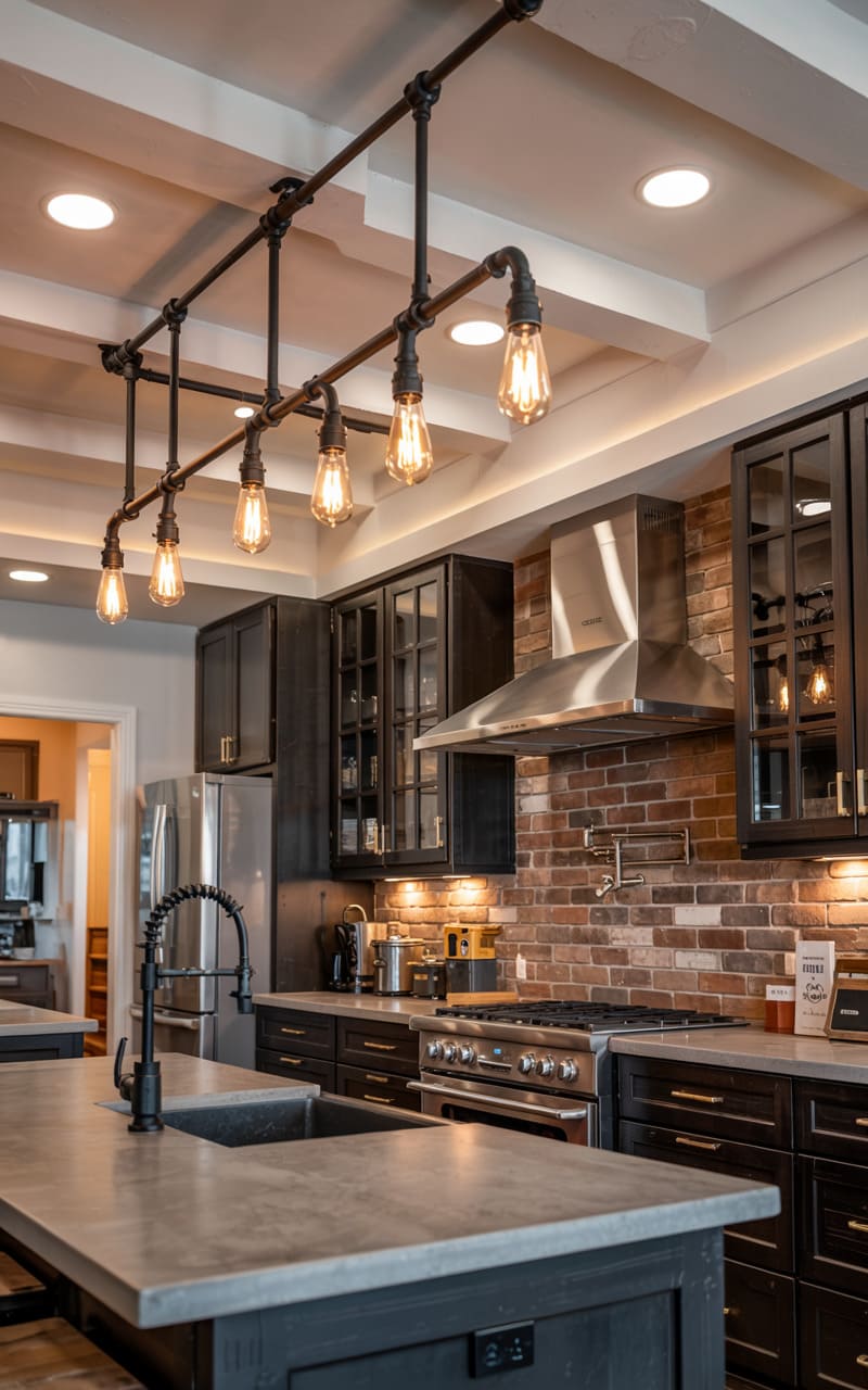 42. Industrial Kitchen with Linear Pipe Chandelier and Task Lighting