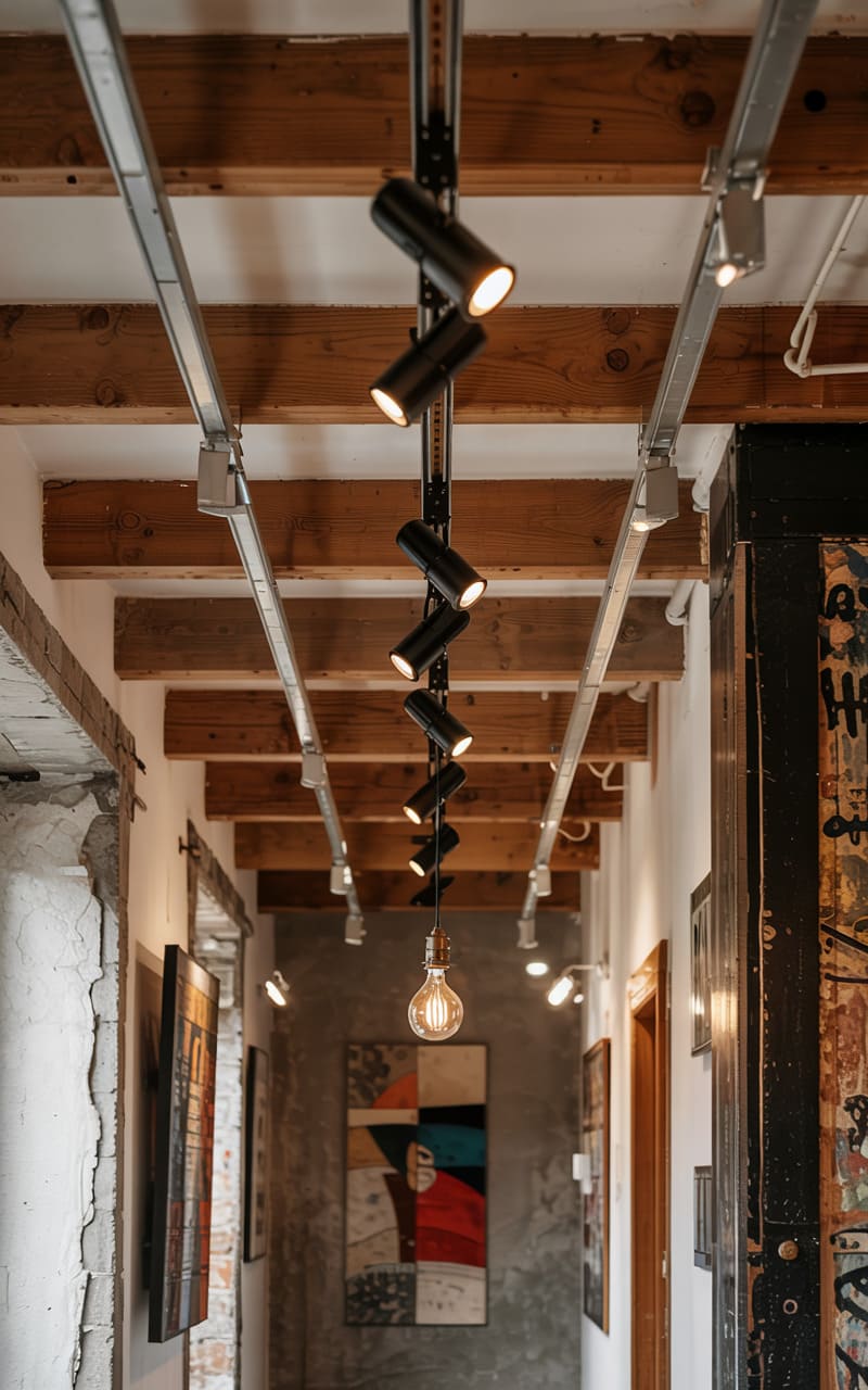 44. Industrial Hallway with Track Lighting on Exposed Ceiling Joists