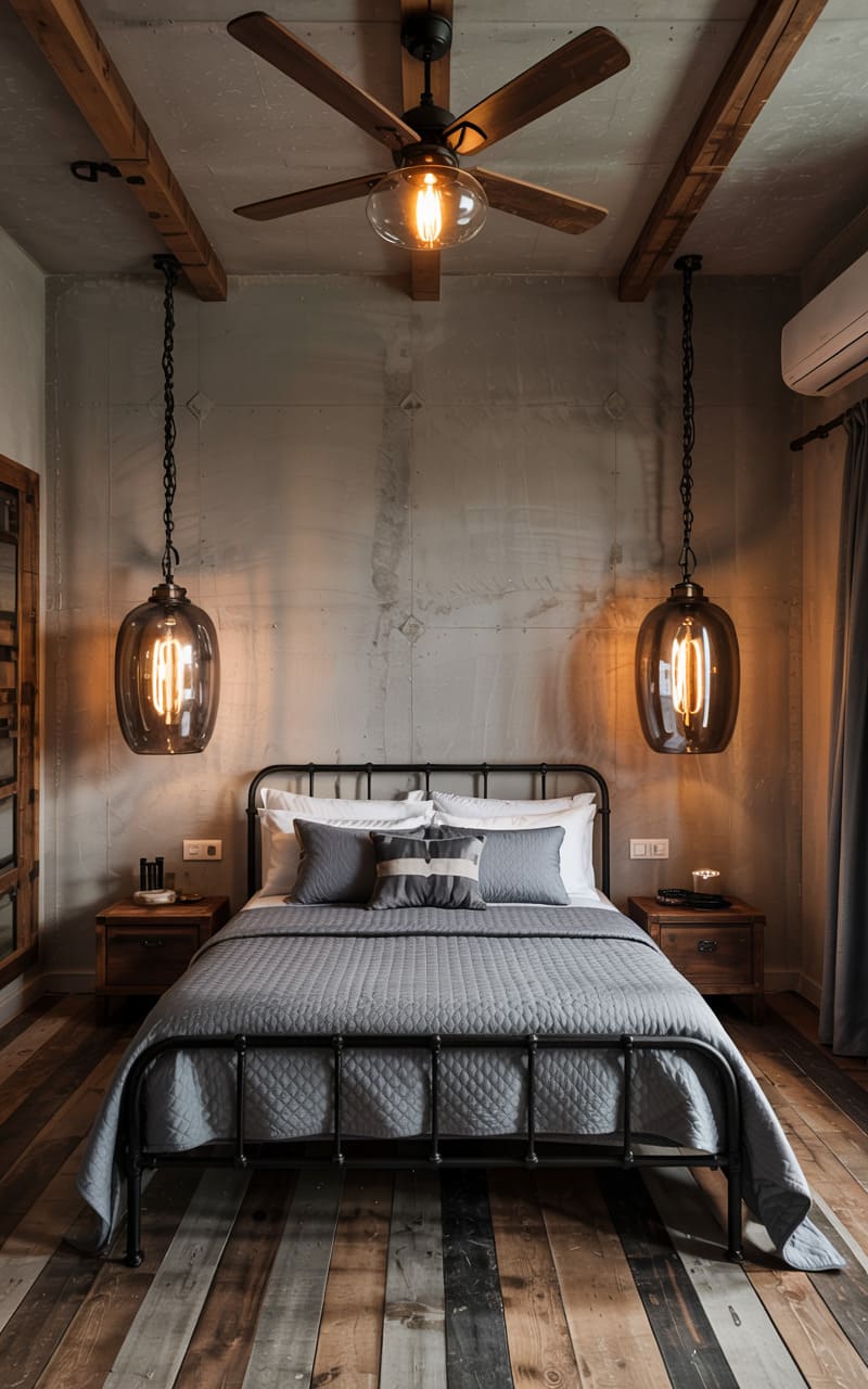 46. Industrial Bedroom with Pendant Lights Hanging from Chains