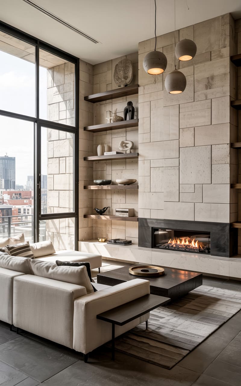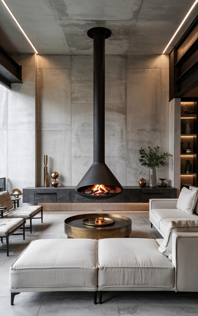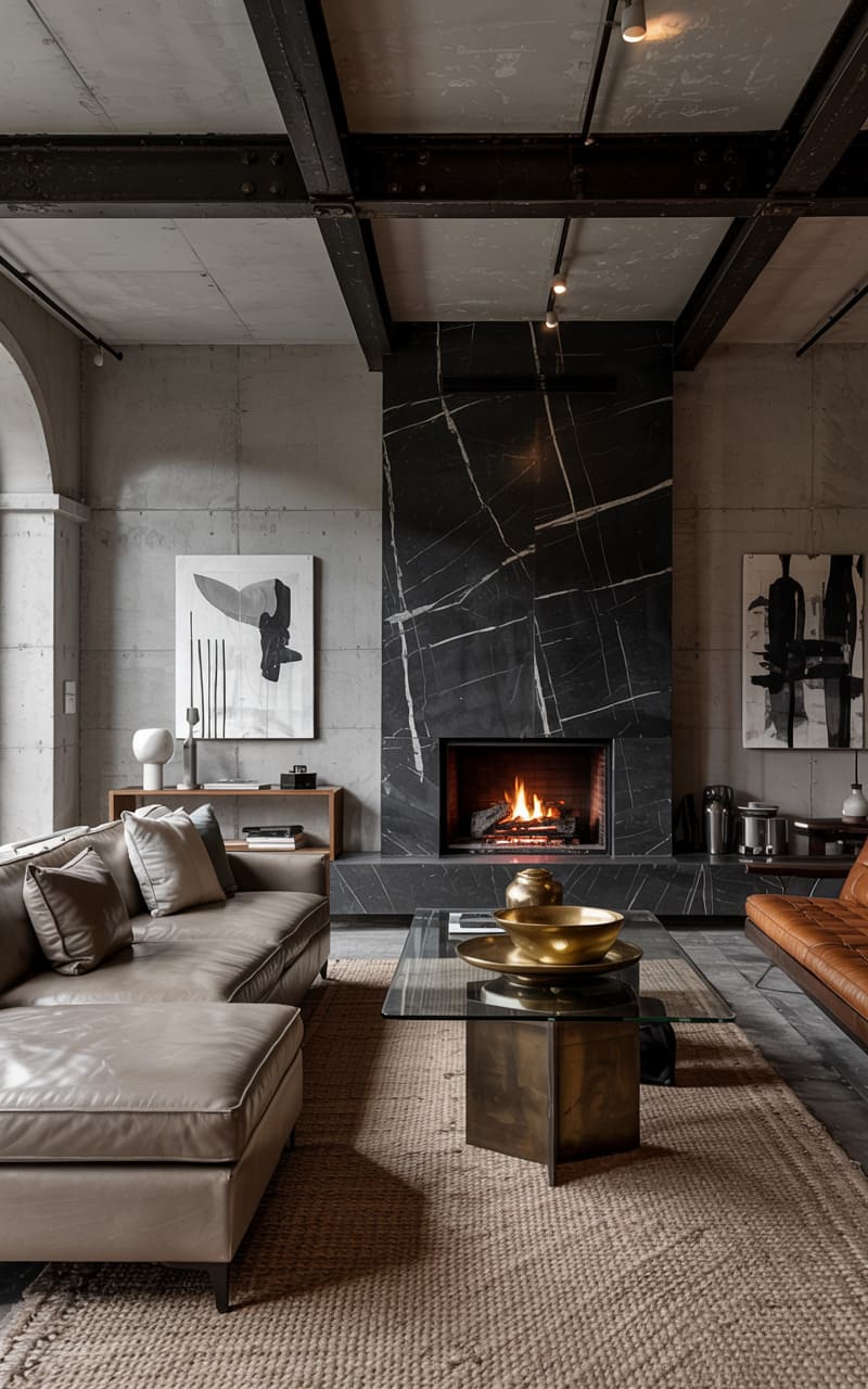 48. Modern Luxury Living Room with Industrial Elements and Dark Marble Fireplace Surround