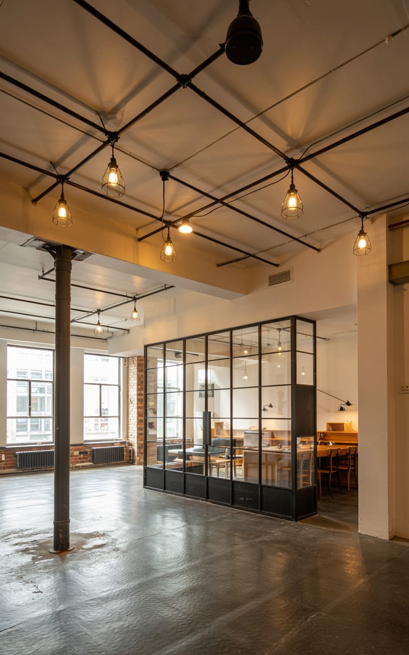 The cavernous room, a relic of some bygone factory era, hums with a quiet energy. Exposed pipes crawl across the high ceiling, each junction punctuated by a caged bulb casting a warm glow on the polished concrete floor. A modern glass and steel partition, a stark contrast to the room’s raw bones, carves out a smaller space, hinting at a workspace within, while the distant windows offer a muted urban tableau. The lone, robust pillar stands sentinel in the vast emptiness, a testament to the structure’s enduring strength.