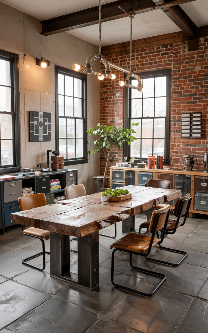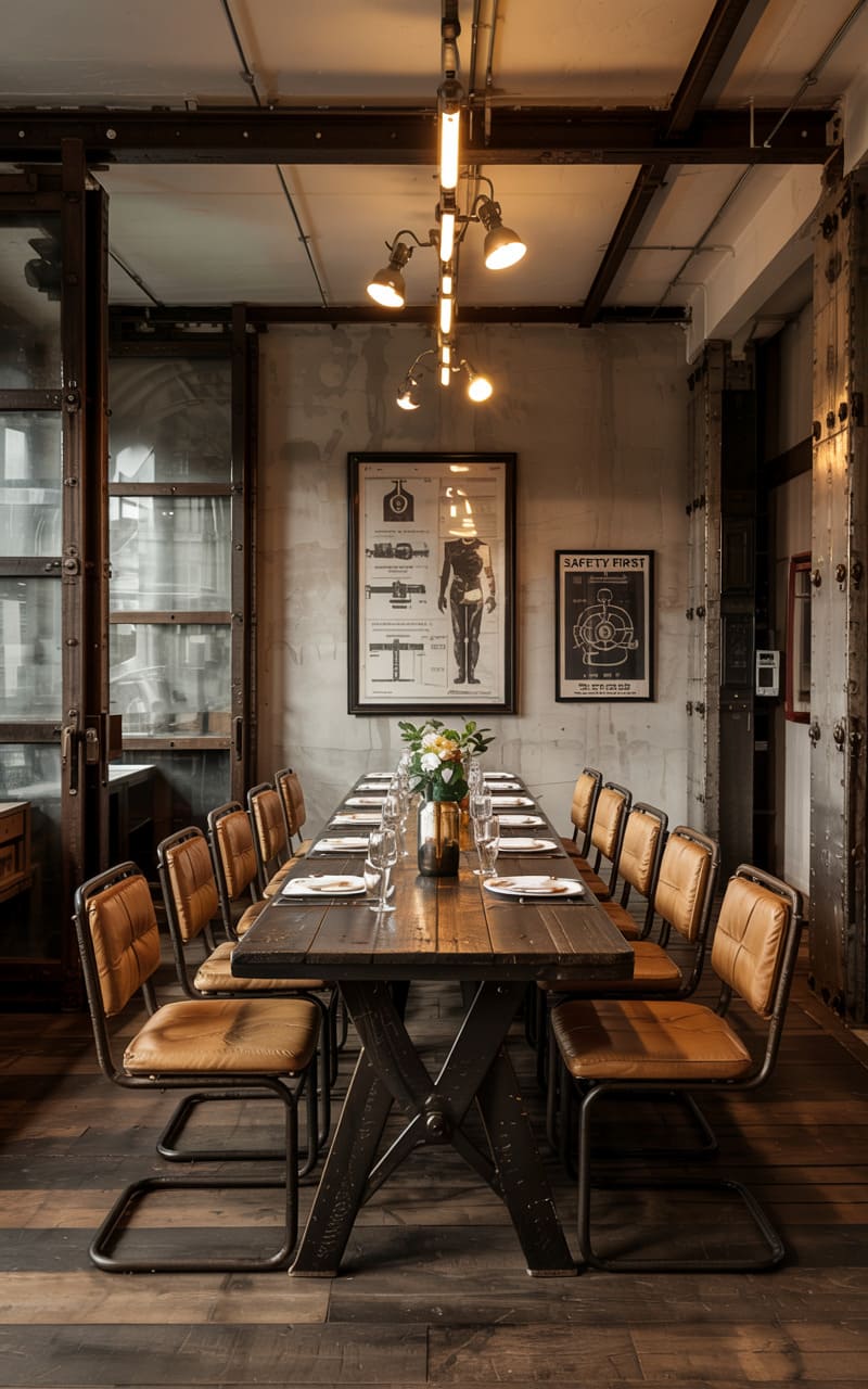 The room hummed with a quiet, almost reverent energy, its exposed brick arches and concrete ceiling whispering tales of a bygone factory floor. A long, darkly stained table, scarred and sturdy, stretched beneath a lone pendant lamp, inviting a gathering. The leather chairs, worn and rich, hinted at countless stories shared, while the metal-rimmed wheels beneath the table legs suggested a room that could transform, adapt, and move with the rhythm of life within it.