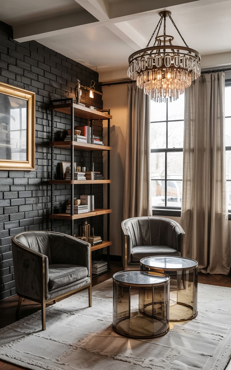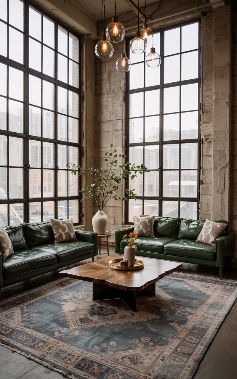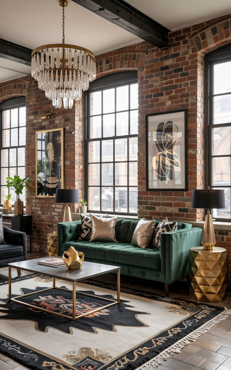 The room balances a gritty, urban feel with a touch of unexpected glamour. A plush emerald velvet sofa grounds the space, its richness playing against the exposed brick walls and the dark, gridded windows that hint at a former factory life. A crystal chandelier, dripping with delicate prisms, hangs above, adding a surprising sparkle to the otherwise raw aesthetic, while the geometric rug and gold accent tables inject a dose of modern sophistication. It’s a space that feels both lived-in and curated, a testament to the beauty found in unexpected juxtapositions.