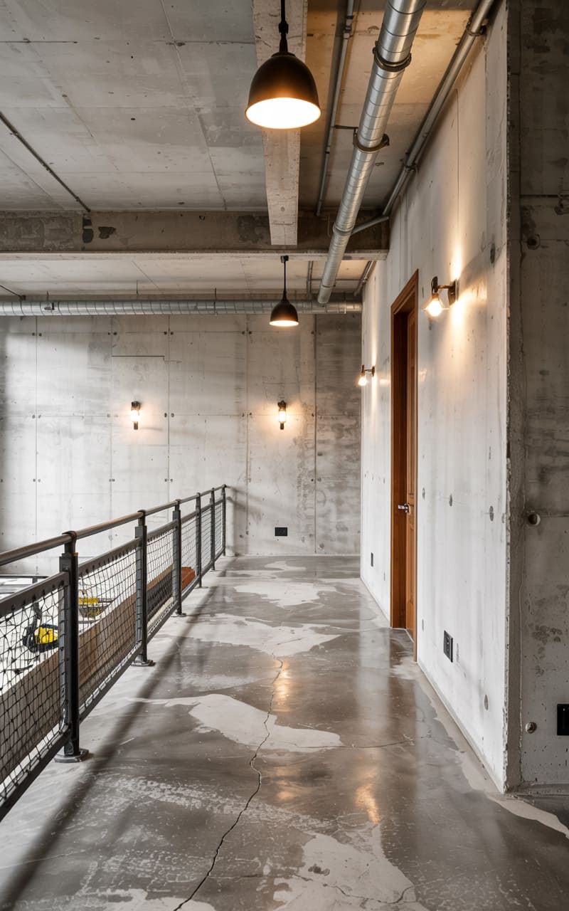 30. Industrial Living Space with Exposed Concrete Shear Walls and Open Ceiling Grid