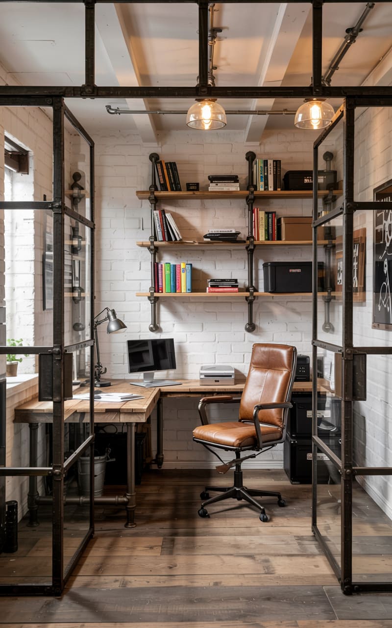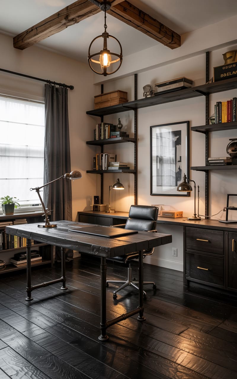 47. Industrial Study with Wall-Mounted Pipe Sconces and Desk Task Lamp