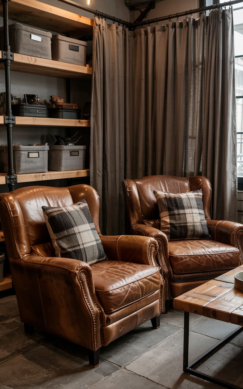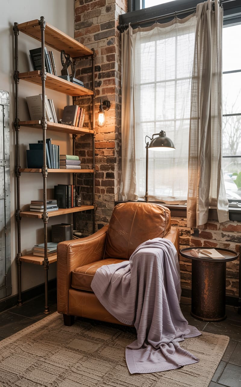 170. Rustic Industrial Reading Nook with Brick Wall, Leather Chair, and Pale Lavender Throw