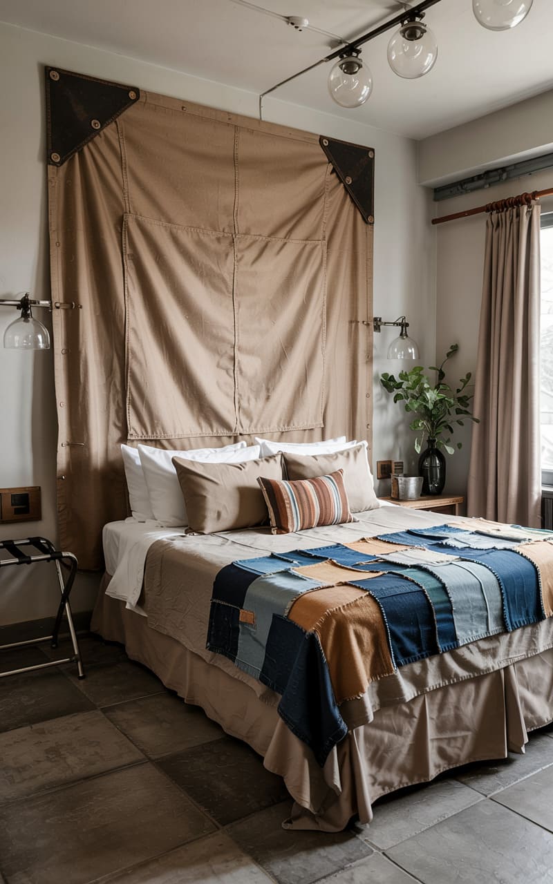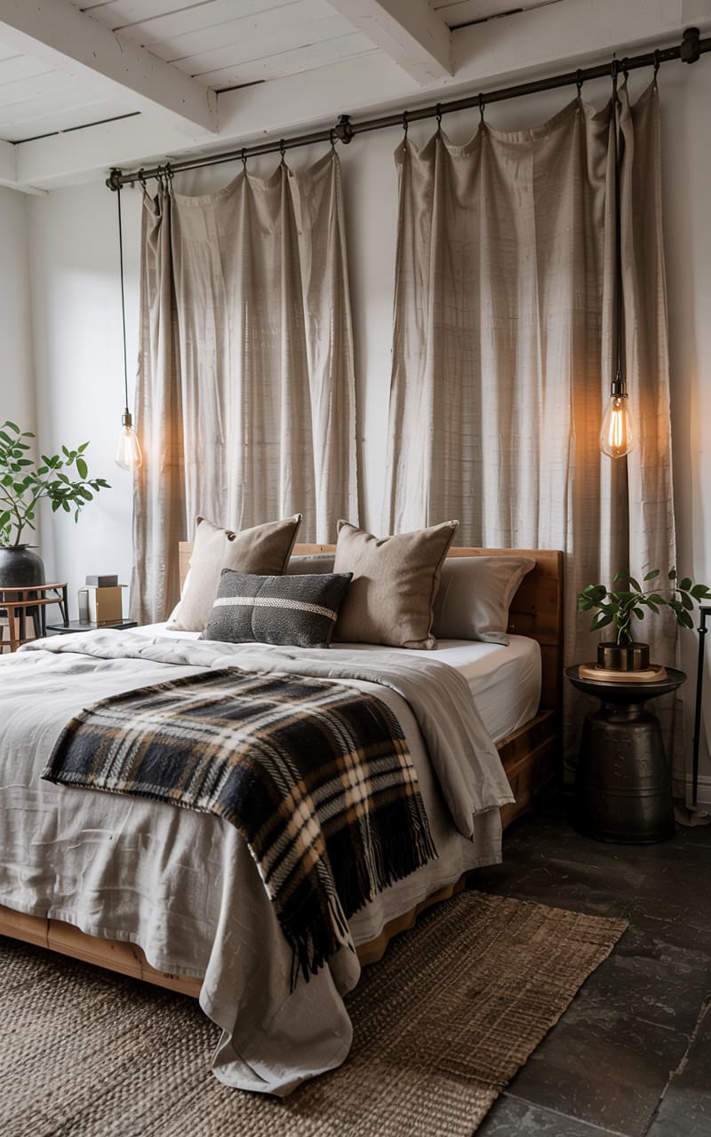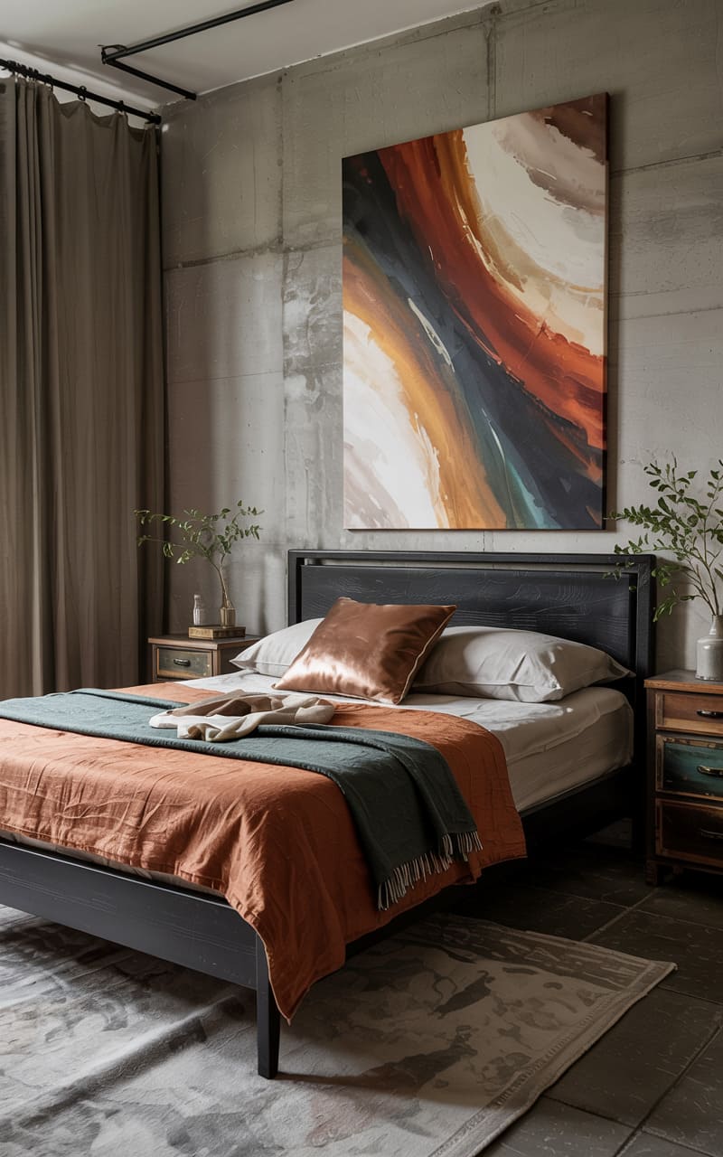 183. Industrial Bedroom with Statement Wall Art, Velvet Drapes, and Layered Textiles in Earthy Tones
