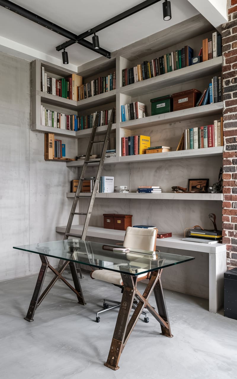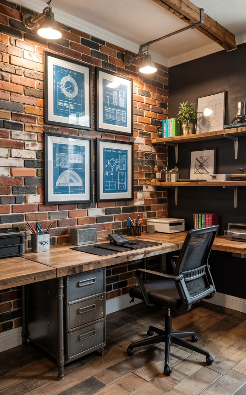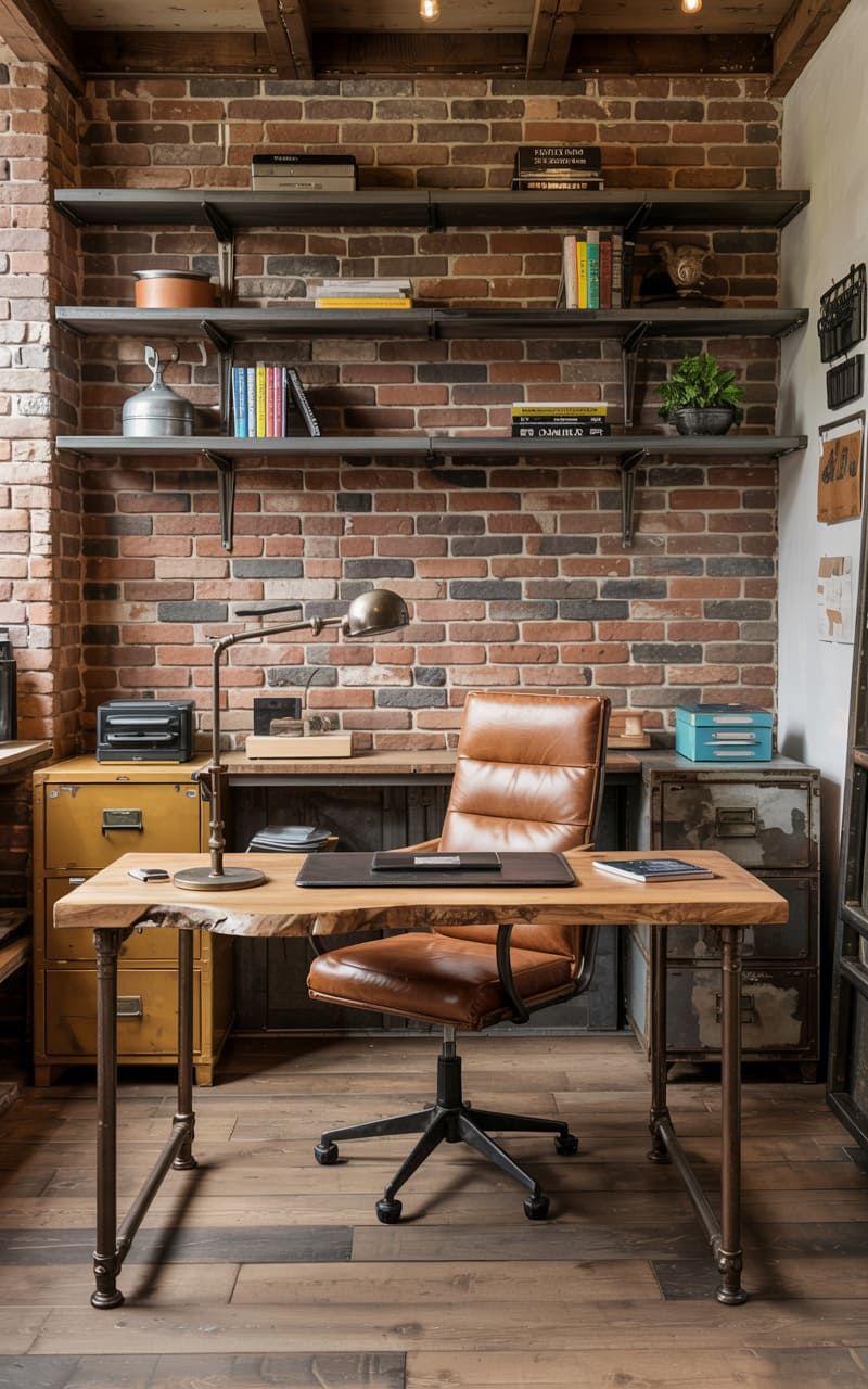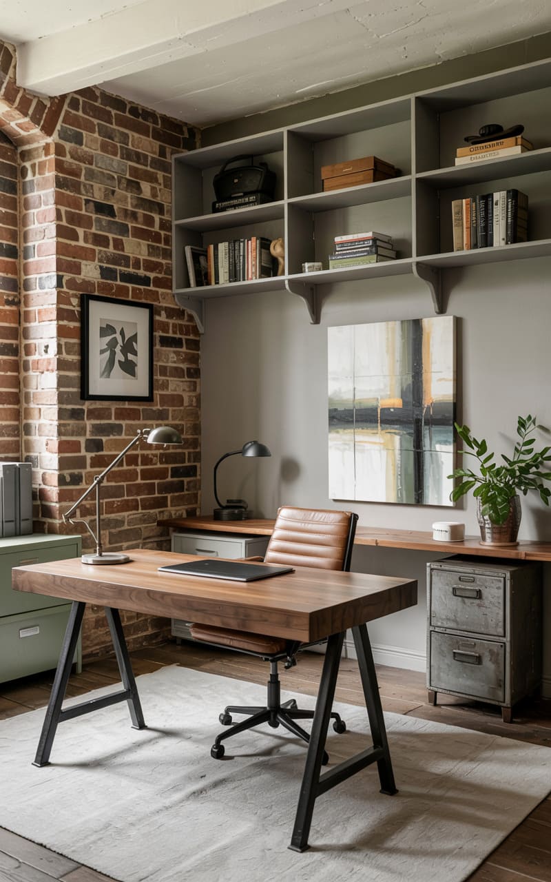 157. Modern Industrial Home Office with Exposed Brick and Sage Green Shelves