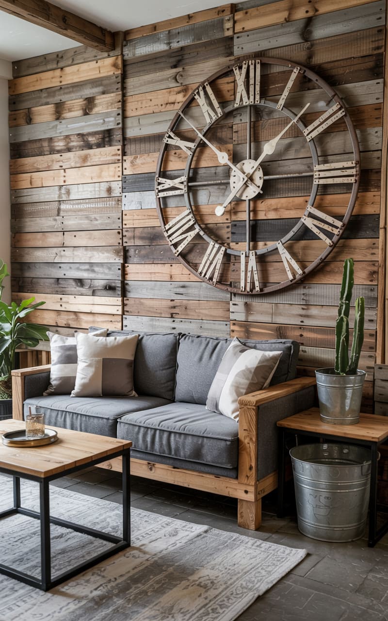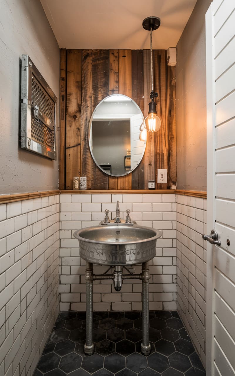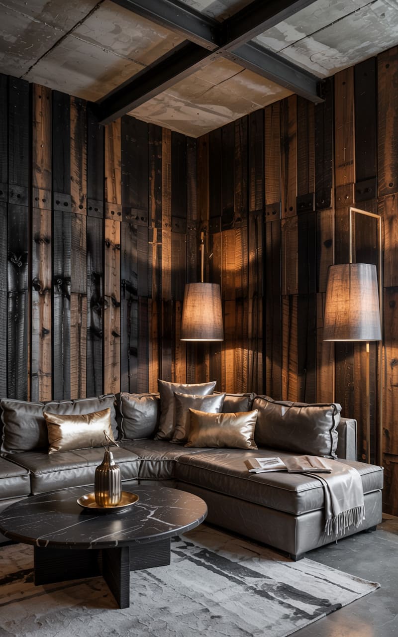 The room hums with a raw, almost defiant energy. Patches of riveted metal, like the hull of a forgotten ship, line one wall, contrasting sharply with the rustic warmth of reclaimed wood planks. The glow from a solitary pendant bulb catches the glint of steel and the deep grain of the timber, while a muted palette of grays and browns envelops the space, hinting at stories whispered in the shadows.