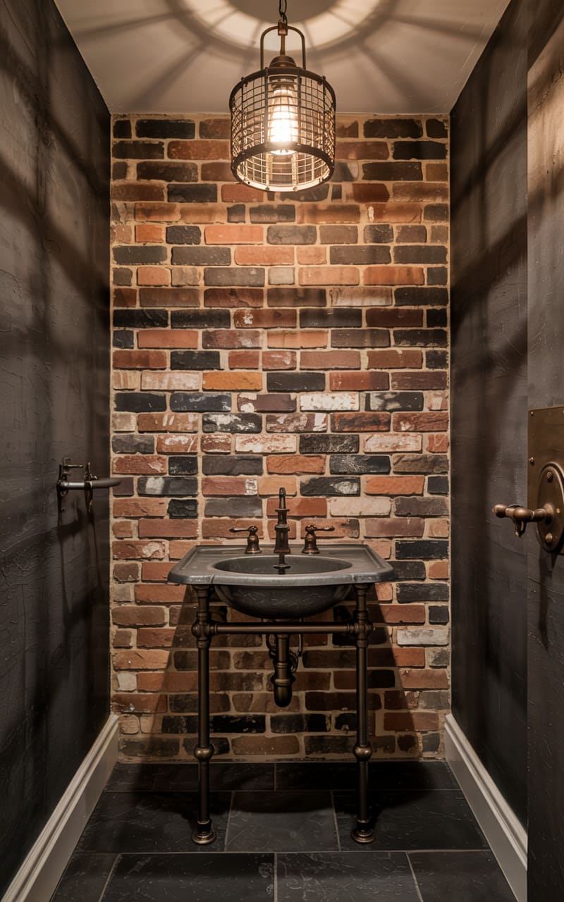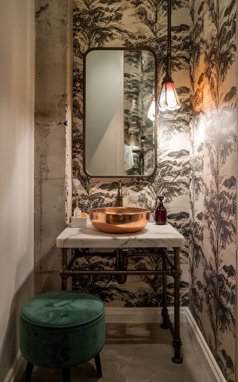 A sliver of drama unfolds in this compact space, where raw concrete meets whimsical toile. The exposed wall, a testament to the building’s bones, contrasts sharply with the delicate, nature-inspired wallpaper, a visual push-and-pull that’s both unexpected and captivating. A gleaming copper basin rests atop a marble surface supported by industrial piping, a quirky juxtaposition that hints at a carefully crafted eccentricity. A single, stained-glass pendant casts a soft, warm glow, highlighting the room’s eclectic blend of textures and styles, a tiny stage set for a moment of quiet indulgence.