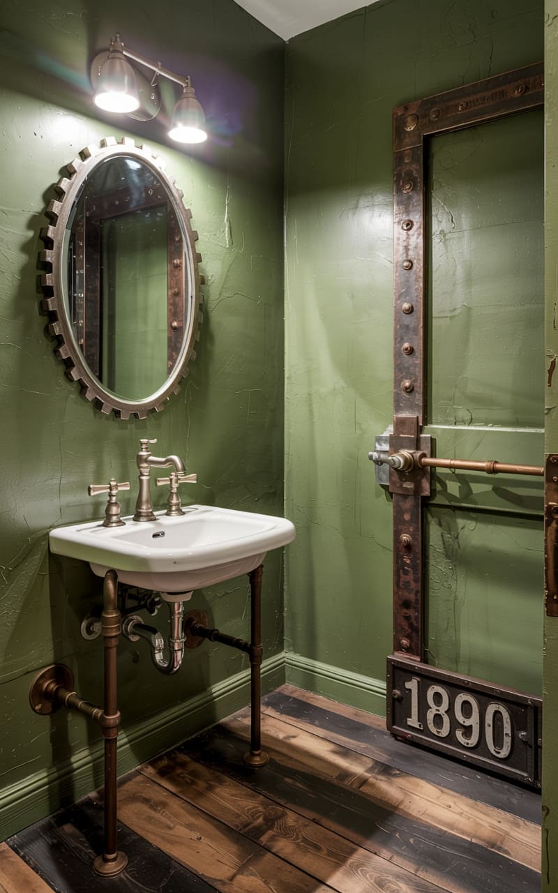 189. Industrial Powder Room with Bold Wallpaper, Pipe Fixtures, and Jewel-Toned Accents