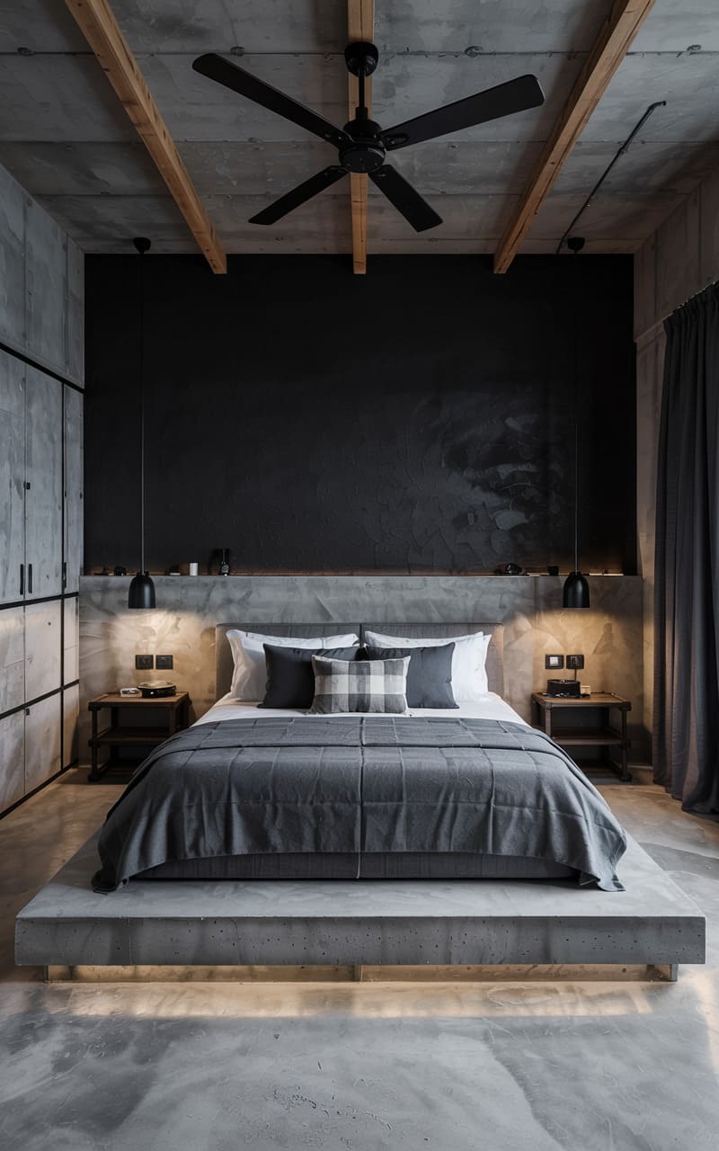 The room exudes a raw, almost theatrical charm, where the rough-hewn concrete wall looms like a stage backdrop, flanked by dark, theatrical pendant lights that cast a warm, intimate glow. A simple iron bedstead anchors the space, its clean lines contrasting with the rustic, mismatched planks of the floor. Overhead, a ceiling fan stirs the air, its wooden blades echoing the room’s earthy palette, while the exposed beams overhead hint at the building’s storied past.