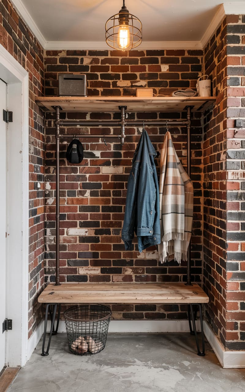 A cozy entryway, where rustic charm meets industrial practicality, welcomes you with a weathered metal bench and warm, worn leather. Hats and scarves hang casually from a rough-hewn shelf, illuminated by the soft glow of a vintage pendant lamp. Woven baskets tucked beneath the bench promise warmth and comfort, while the subtle texture of the wood-paneled walls hints at a life lived close to nature. It’s a space that whispers of simple pleasures and the comforting embrace of home.