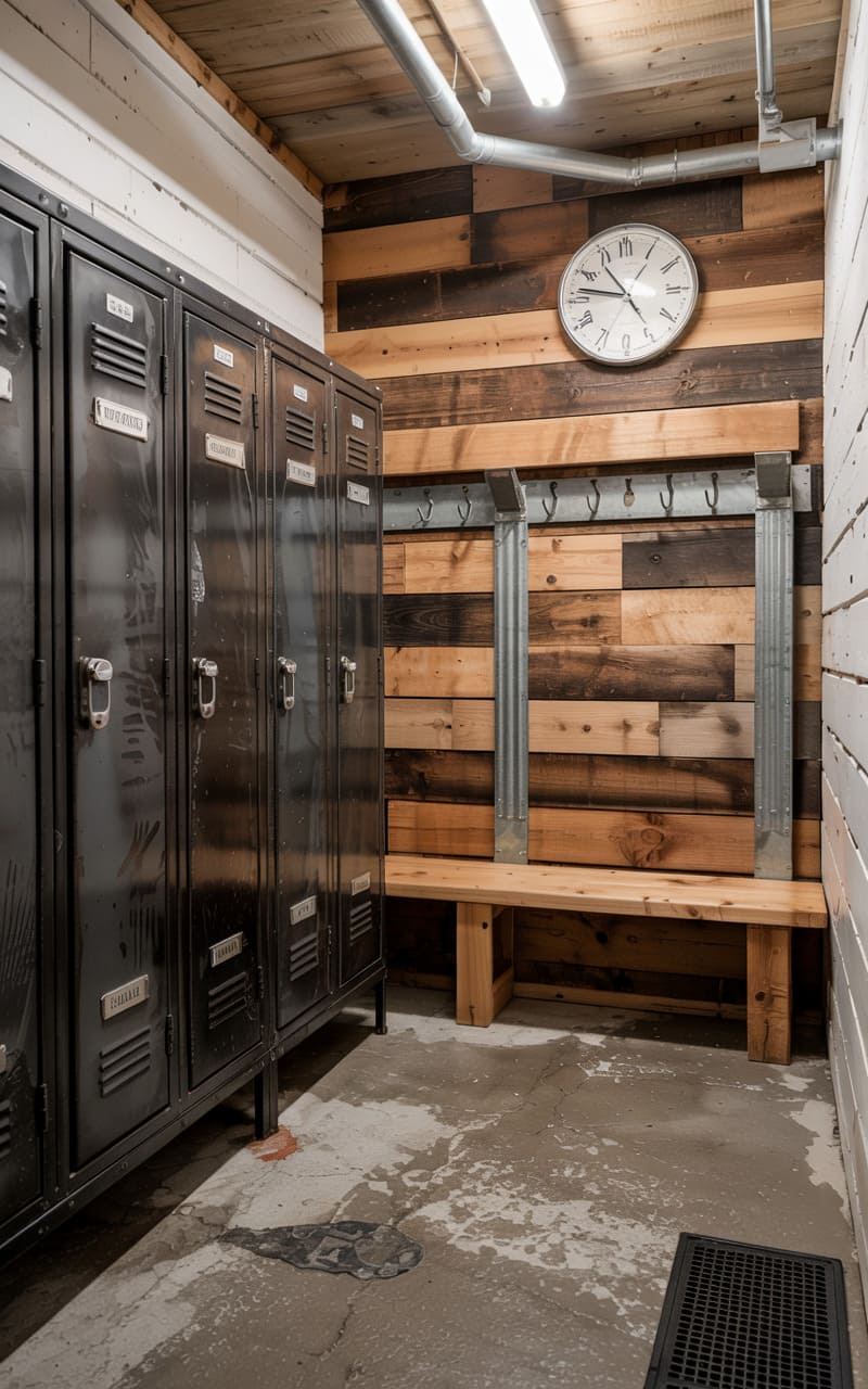 169. Rustic Industrial Mudroom with Steel Locker Cubbies and Sage Green Wall Paint