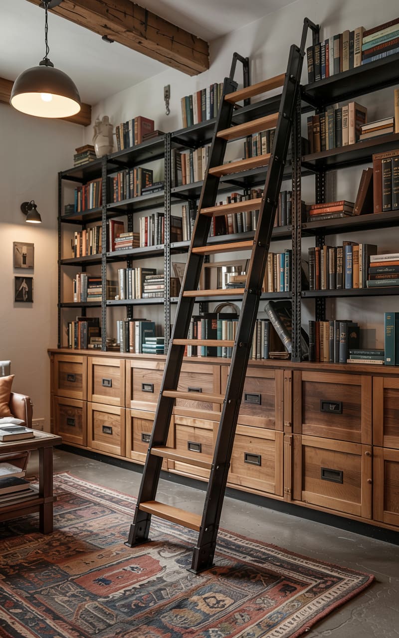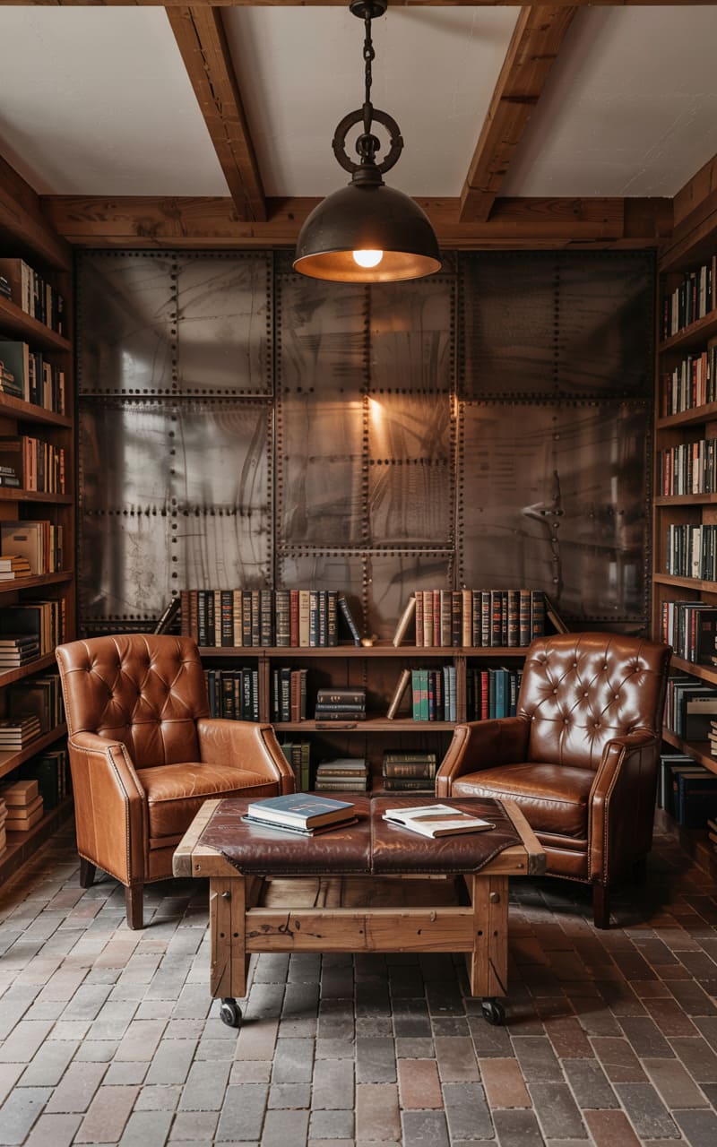 185. Industrial Home Library with Floor-to-Ceiling Bookshelves, Leather Furniture, and Accent Wallpaper