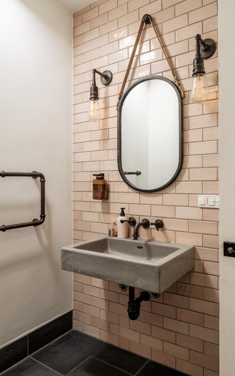 A quirky mix of textures and styles defines this small space. Pale brick tiles, laid with a subtle imperfection, line the wall behind a stark concrete sink, its rough finish a counterpoint to the polished faucets. Twin sconces, their exposed bulbs casting a warm, utilitarian glow, flank a darkly framed oval mirror, suspended by leather straps for an unexpected touch of rustic charm. The exposed pipes, a hallmark of industrial design, add a raw, honest element, while the dark tile floor anchors the room with a grounded, almost moody presence. It’s a bathroom that embraces its imperfections, a testament to the beauty found in unexpected juxtapositions.