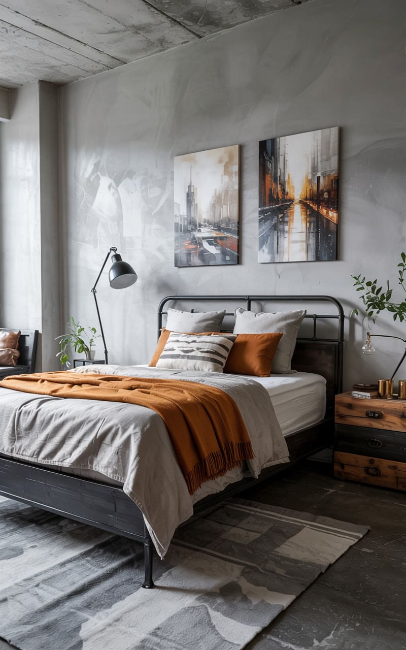 154. Modern Industrial Bedroom with Soft Gray Walls and Burnt Orange Accents