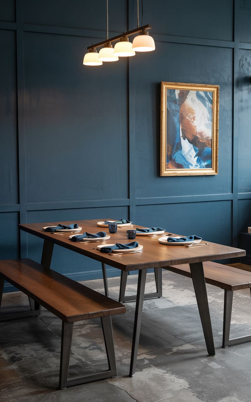 This dining space, a study in moody elegance, centers around a robust, live-edge table, its rich wood grain a warm counterpoint to the cool, deep teal of the paneled walls. Industrial-inspired metal legs ground the table, echoing the clean lines of the matching benches, while a row of frosted pendant lights casts a soft, diffused glow, highlighting the simple place settings. A framed abstract painting adds a touch of artistic intrigue, its golden frame a subtle spark against the room’s prevailing depth, hinting at intimate gatherings and hushed conversations.