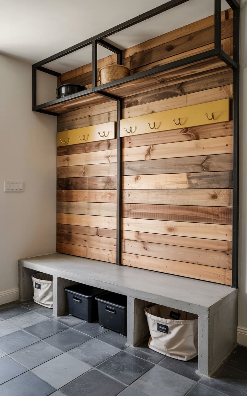 156. Modern Industrial Mudroom with Concrete Bench and Mustard Yellow Accent Hooks