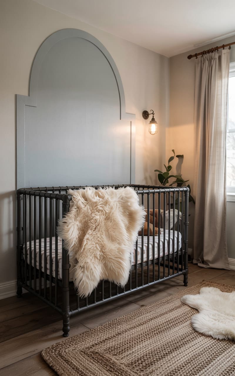A cradle of industrial chic, this nursery balances strength and softness with a dark metal crib, its sturdy lines softened by a cloud-like throw. The muted palette, punctuated by a whimsical arch painted on the wall, creates a serene haven, while a braided rug and a glimpse of greenery add a touch of earthy warmth. It’s a space that feels both grounded and dreamlike, a perfect blend of modern edge and gentle comfort for a little one.