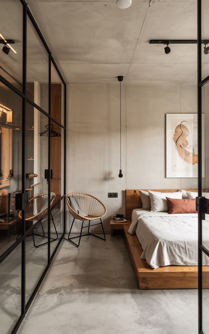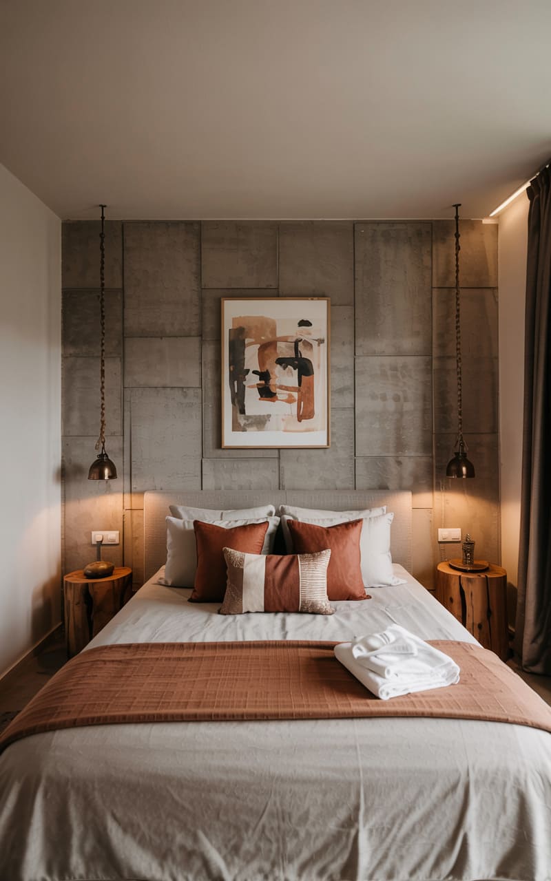 159. Modern Industrial Guest Room with Terracotta Textiles and Concrete Wall Panels