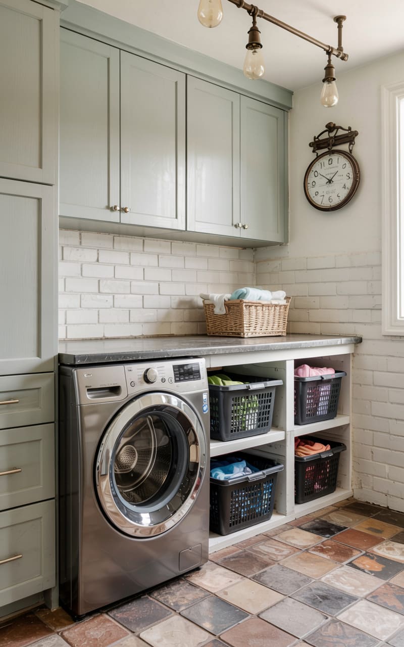 This laundry room, a blend of practicality and personality, features a sleek stainless steel washer juxtaposed against the warmth of patterned terracotta tiles. Pale grey cabinetry, punctuated by a vintage-style clock, lines the walls, while open shelving houses woven baskets brimming with colorful laundry. The overhead industrial light fixture, with its exposed bulbs, casts a functional glow, highlighting the clean lines and the promise of order in this well-organized space.