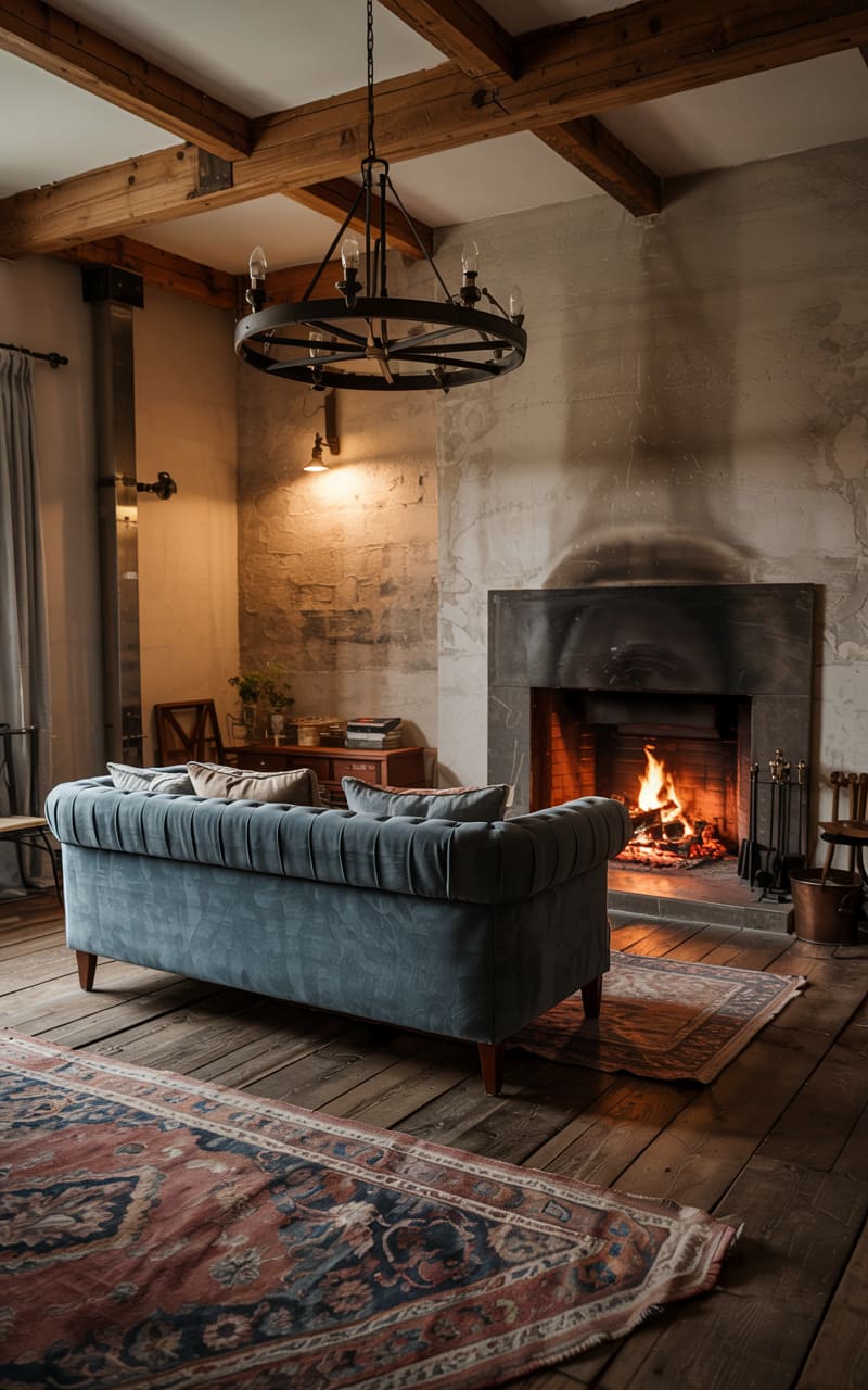A rustic symphony of textures unfolds in this room, where timeworn wooden planks stretch beneath a plush velvet sofa, facing a hearth aglow with flickering flames. Exposed beams crisscross overhead, lending a sense of raw, unfinished grandeur, while the weighty iron chandelier casts a dim, dramatic illumination, hinting at whispered stories and the comforting warmth of a space steeped in history.