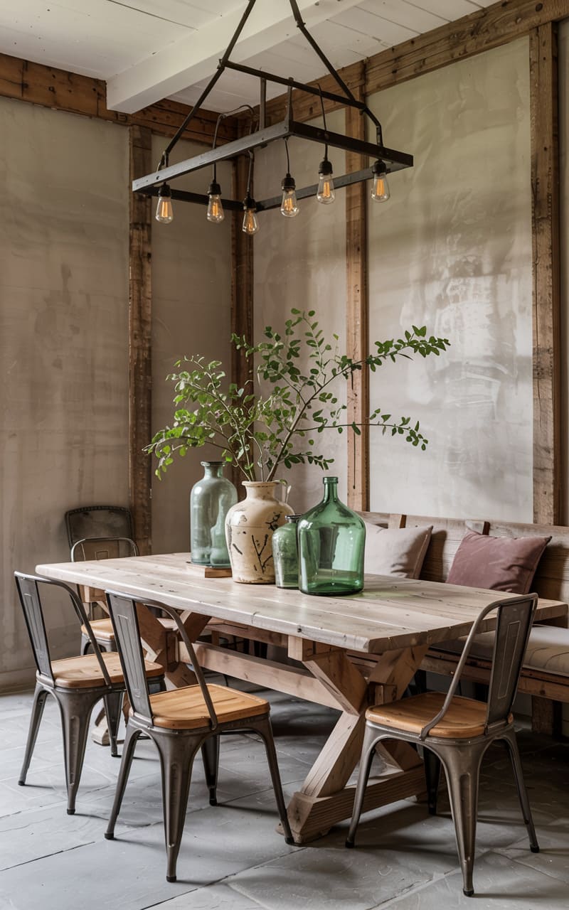 A rustic charm emanates from this dining space, where a chunky, reclaimed wood table anchors the room, its weathered surface hinting at tales of past gatherings. Metal bistro chairs, their lines clean and simple, surround the table, offering a touch of industrial cool against the warm tones of the wood. Overhead, a skeletal chandelier, its bare bulbs glowing softly, casts a gentle luminescence upon the collection of glass vases clustered at the table’s center, their organic shapes softening the room’s otherwise structured aesthetic. The walls, textured and muted, speak of age and character, creating a backdrop that feels both lived-in and thoughtfully curated.