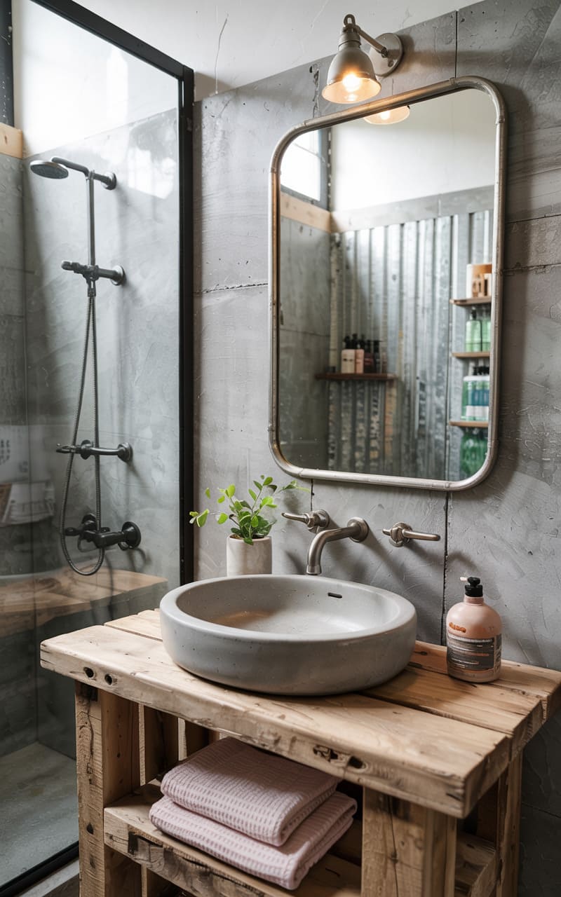 Raw and refined collide in this utilitarian washroom, where the cool, smooth basin of a concrete sink rests atop a rustic pallet-wood vanity, its rough-hewn charm softened by neatly folded towels. A framed mirror, its edges rounded, reflects the corrugated metal of the shower stall, a stark contrast to the small, vibrant plant that adds a touch of life to the space. The single, exposed bulb casts a practical, unadorned light, highlighting the room’s honest, functional beauty.