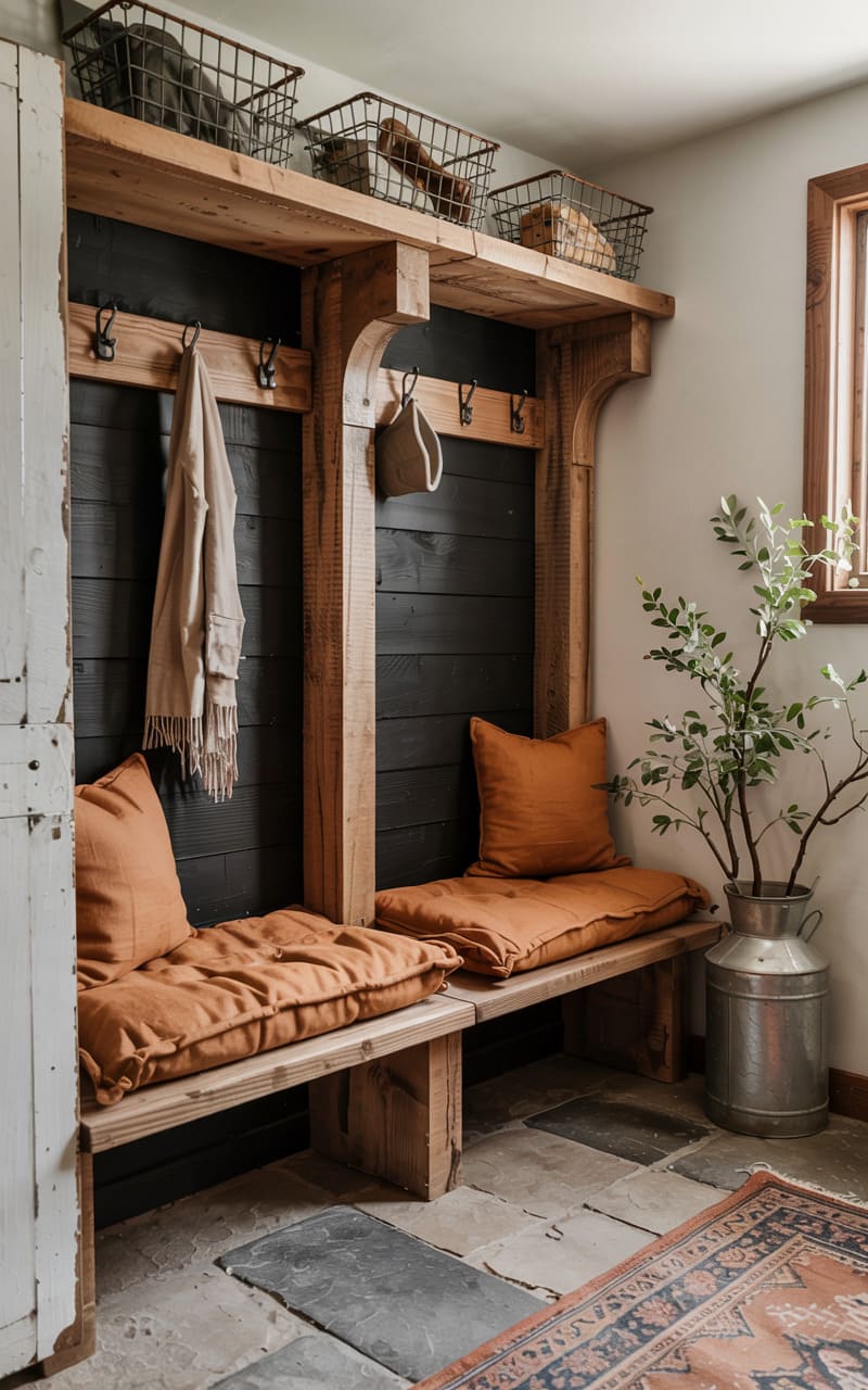 This entryway, a rustic symphony of reclaimed wood and blackened planks, welcomes with a lived-in charm. Benches crafted from thick timber offer a place to pause, their burnt-orange cushions a vibrant contrast to the charcoal backdrop, while wire baskets perched on rough-hewn shelves hint at organized chaos. A slender sapling in a galvanized container softens the edges, bringing a touch of the outdoors into this space where practicality meets a warm, weathered aesthetic.