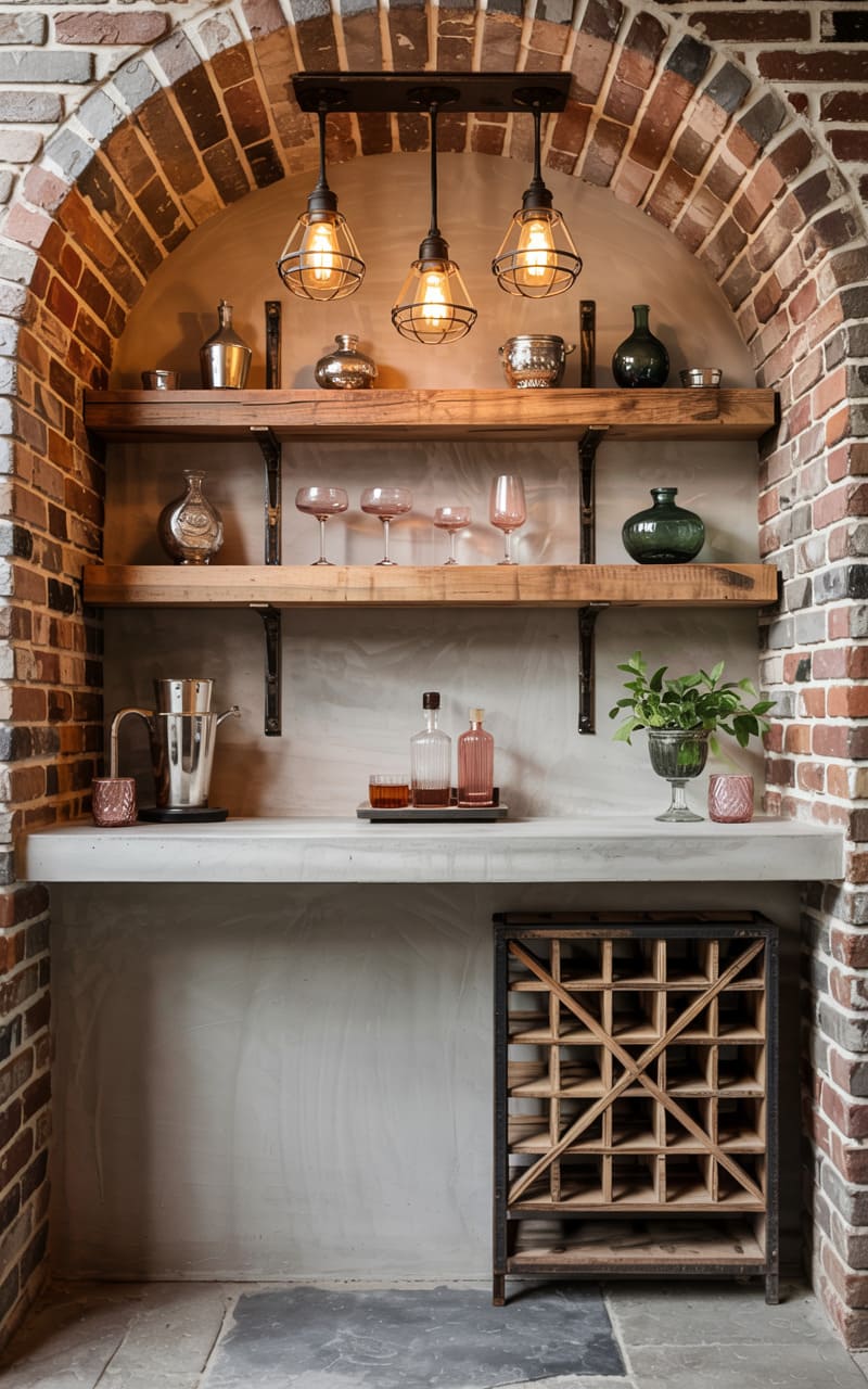 Nestled within a rustic brick archway, this intimate bar nook blends industrial grit with a touch of curated elegance. The rough-hewn brick frames smooth, weathered shelves displaying a collection of glassware and decanters, catching the warm glow from the cage-like pendant lights above. A cool, concrete countertop anchors the space, contrasting with the aged brick and the geometric wine rack below, creating a cozy yet sophisticated spot for quiet contemplation or intimate gatherings.