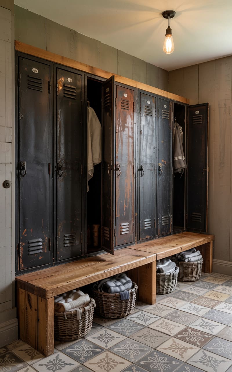 Echoes of a bygone era fill this space, where a row of weathered metal lockers, their paint chipped and stories etched in rust, stand as a testament to hard-worn utility. Rustic wooden benches, softened by woven baskets overflowing with textiles, offer a moment of respite beneath a single, glowing bulb, the warm light highlighting the intricate patterns of the tiled floor. This isn’t just a room; it’s a slice of history, repurposed and imbued with a quiet, industrial charm.