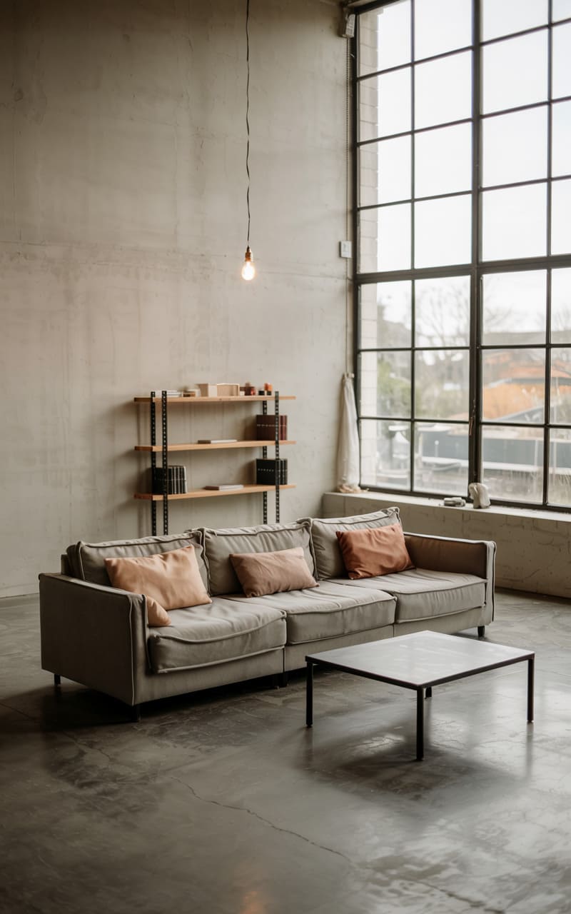 171. Minimalist Industrial Living Room with Concrete Walls and Soft Peach Accent Pillows