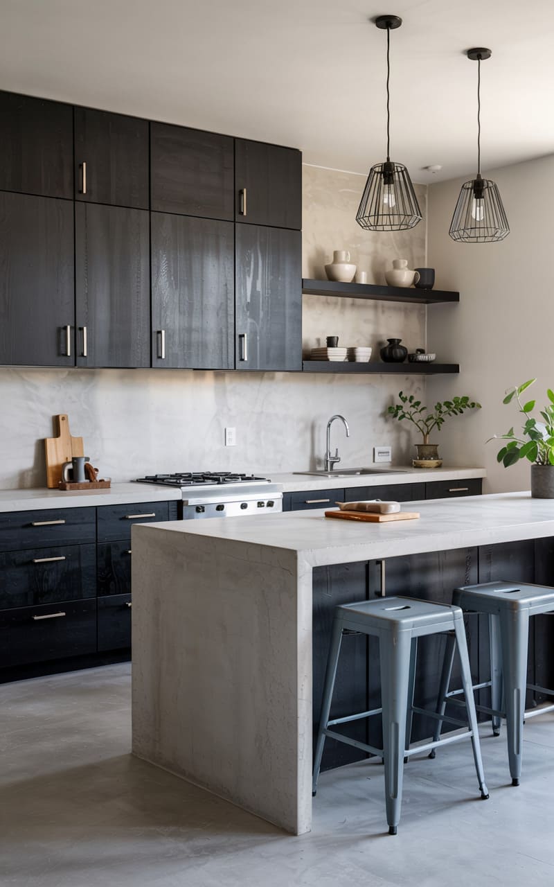 This kitchen, a study in contemporary restraint, melds the raw with the refined. Sleek, charcoal cabinetry recedes against a backdrop of honed stone, while a substantial concrete island, the room’s focal point, anchors the space with its weighty presence. Twin wire-cage pendants dangle overhead, casting a focused glow on the minimalist surfaces, a subtle contrast to the organic curves of a small bonsai. The polished concrete floor reflects the cool tones, creating a sense of spaciousness, a blank canvas for culinary artistry.