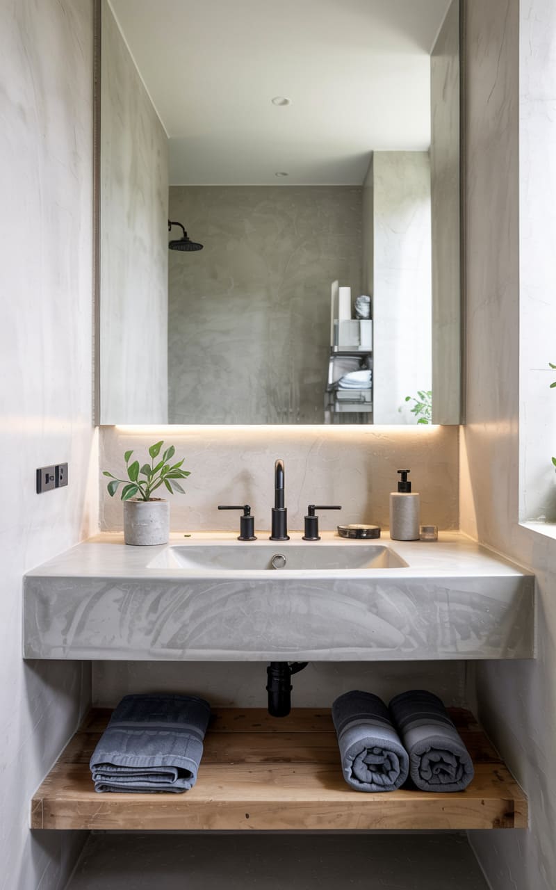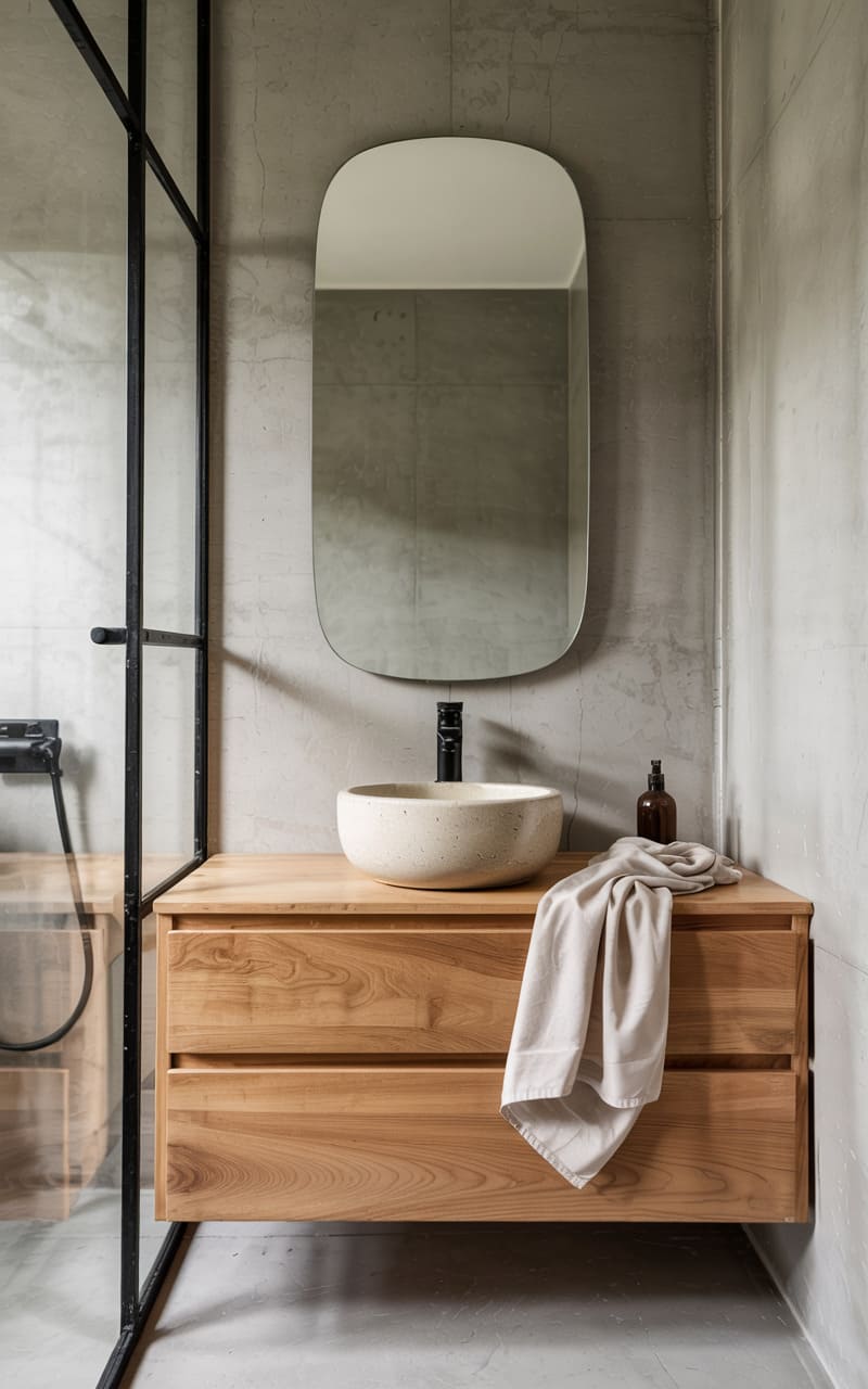 196. Industrial-Japandi Bathroom with Concrete Walls and Minimal Ash Wood Vanity