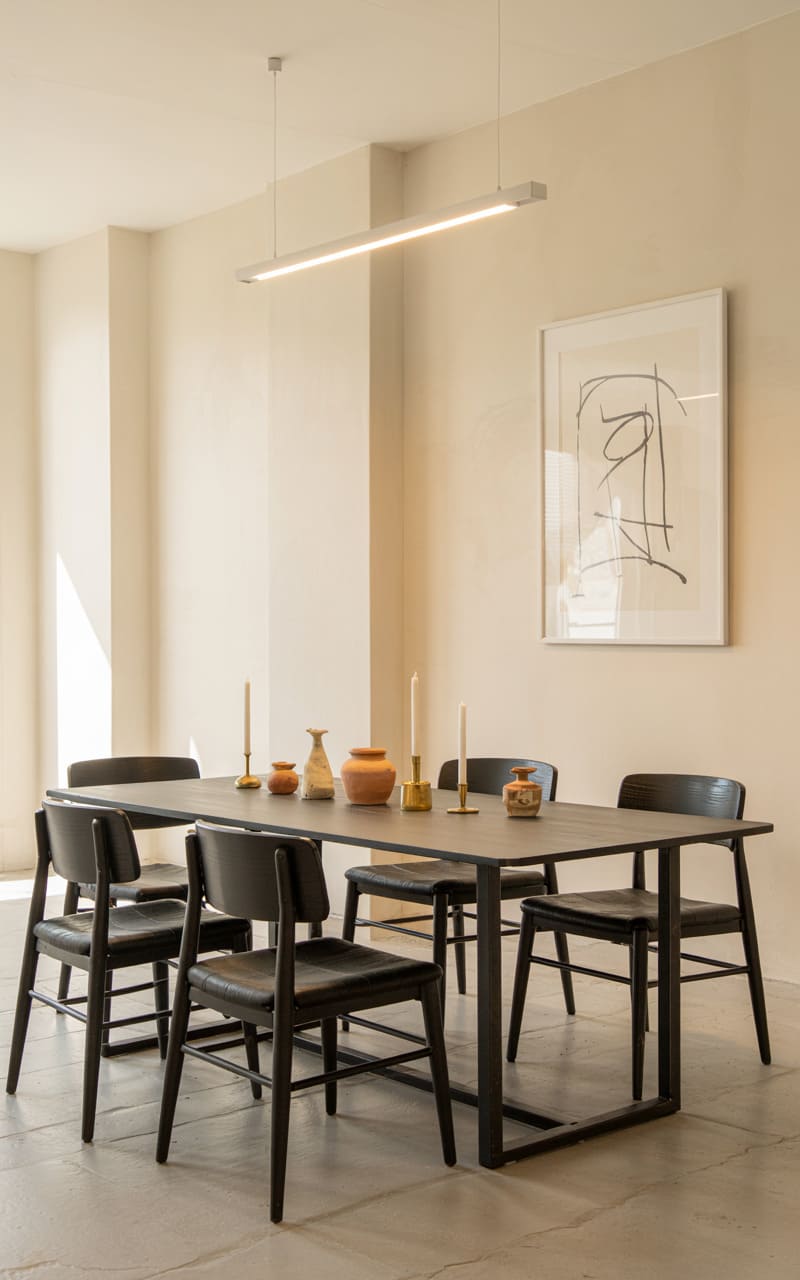 This space whispers of understated elegance, a study in muted tones and clean lines. The sleek, rectangular table, its surface a dark, tactile plane, anchors the room, surrounded by chairs that echo its minimalist form. A linear light fixture, suspended overhead, casts a soft, even glow, highlighting the subtle textures of the walls and the polished concrete floor. The artwork, a study in abstract strokes, adds a touch of quiet intrigue, while the scattering of ceramic vessels on the table suggests a space that is both curated and casually lived-in. There’s a sense of serene austerity here, a deliberate stripping away of excess to reveal the beauty of simple forms.