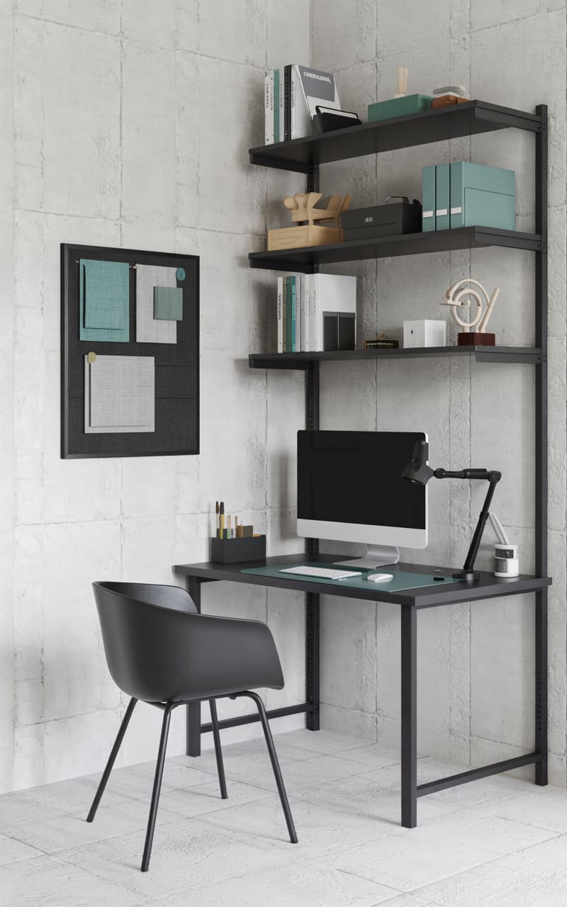 176. Minimalist Industrial Home Office with Slim Desk and Muted Teal Accessories
