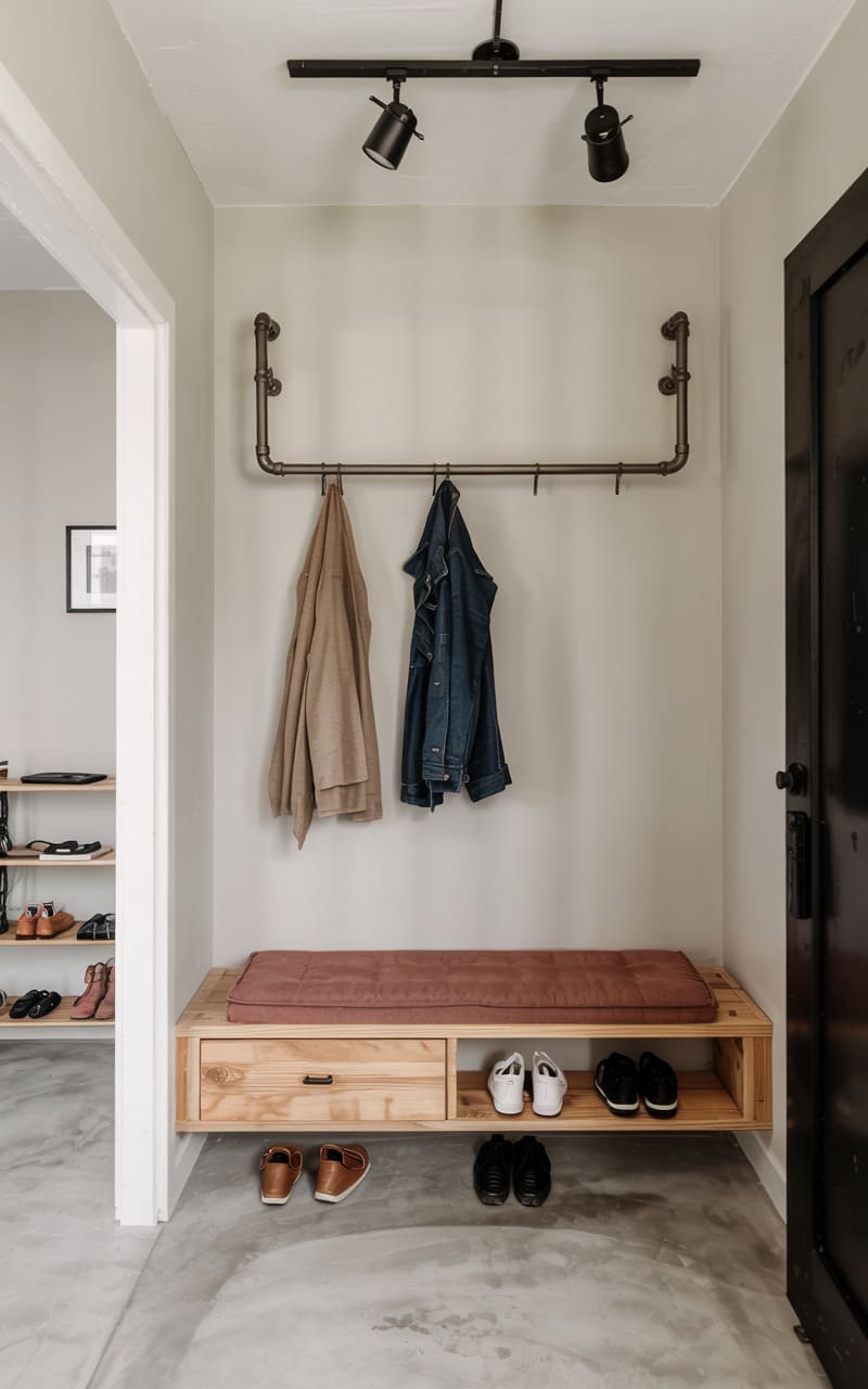 A minimalist entryway, where the cool restraint of polished concrete meets the raw charm of exposed pipe, offers a stripped-down welcome. A simple wooden bench, its plush cushion a lone touch of warmth, floats above a collection of neatly arranged shoes, while a pair of jackets hang from a pipe-turned-coat rack, like stage props in a play about utilitarian chic. Overhead, black track lighting casts a focused glow, highlighting the room’s stark geometry and the quiet elegance of its functional design.