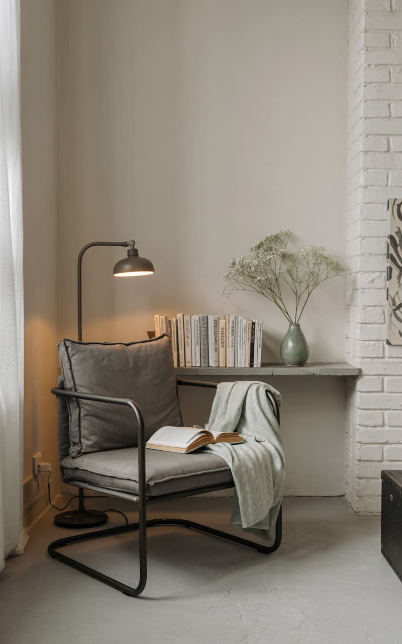 178. Minimalist Industrial Reading Nook with Steel Frame Chair and Pale Mint Throw