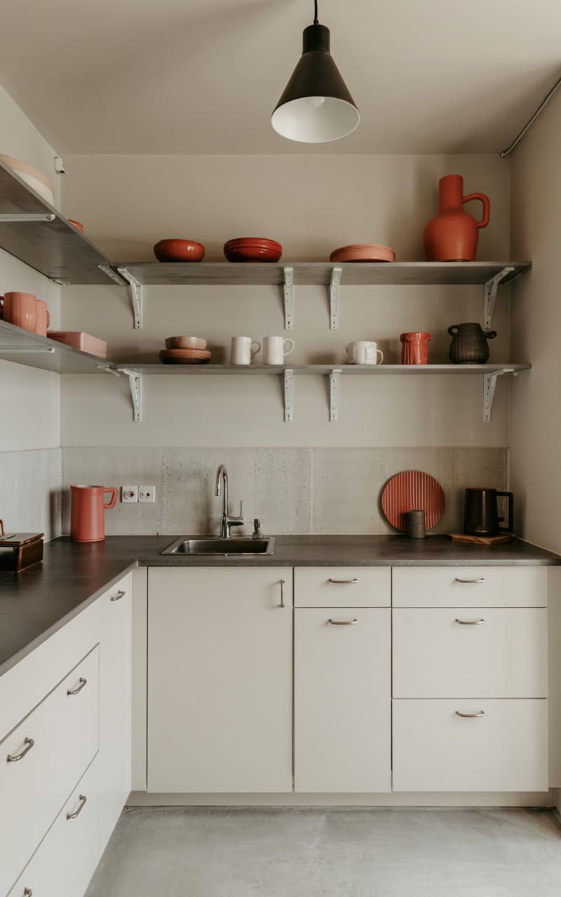 179. Minimalist Industrial Kitchenette with Floating Shelves and Coral Accent Ceramics