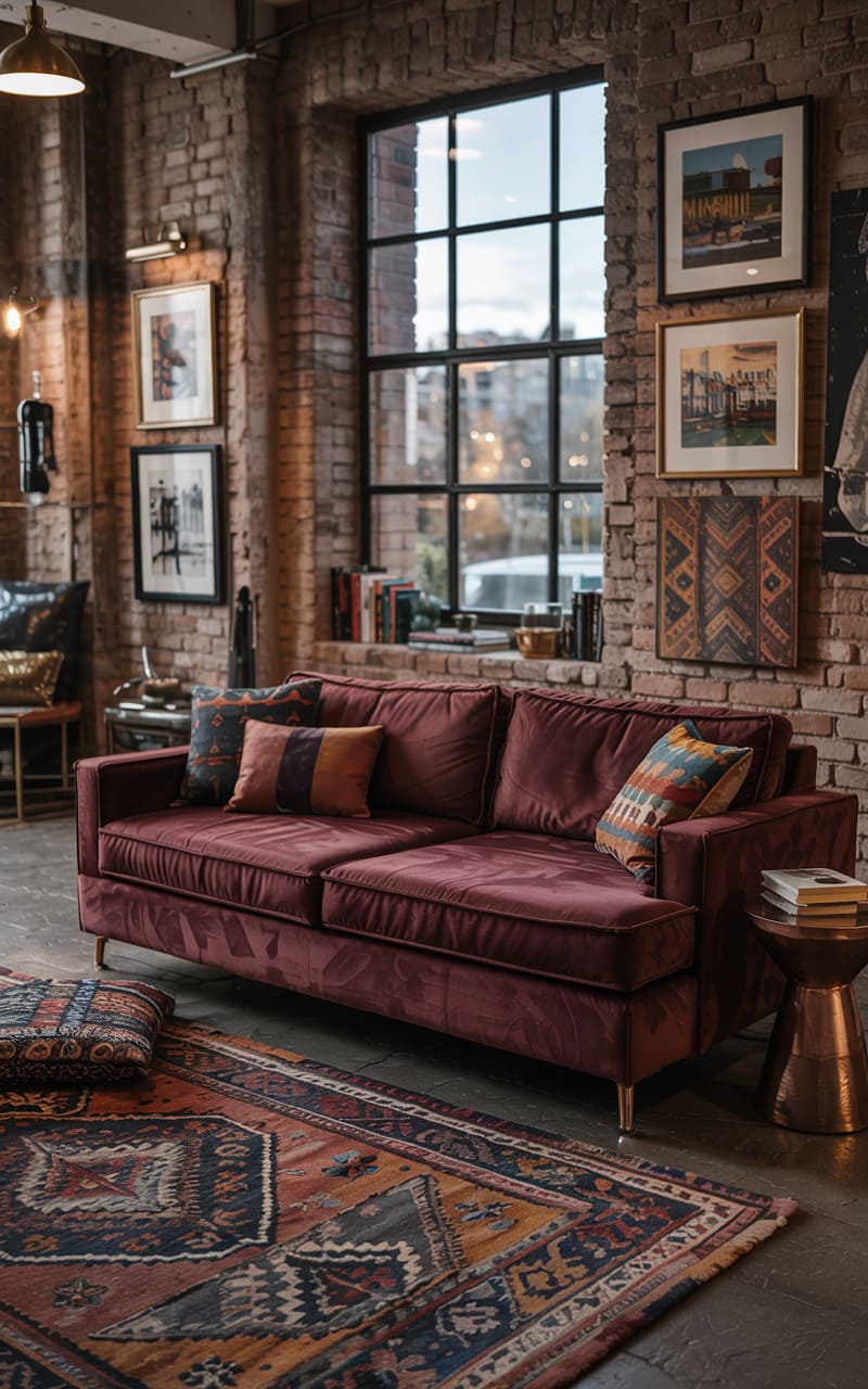 A rich, burgundy velvet sofa anchors the space, its plushness a striking contrast to the exposed brick walls that whisper tales of bygone industry. Patterned rugs and pillows add a bohemian flair, while framed artwork climbs the brick, injecting a sense of lived-in artistry. A large, dark-framed window hints at the urban landscape beyond, its grid a graphic element against the textured backdrop. This is a room where comfort and grit collide, a curated sanctuary carved from the bones of a factory floor.