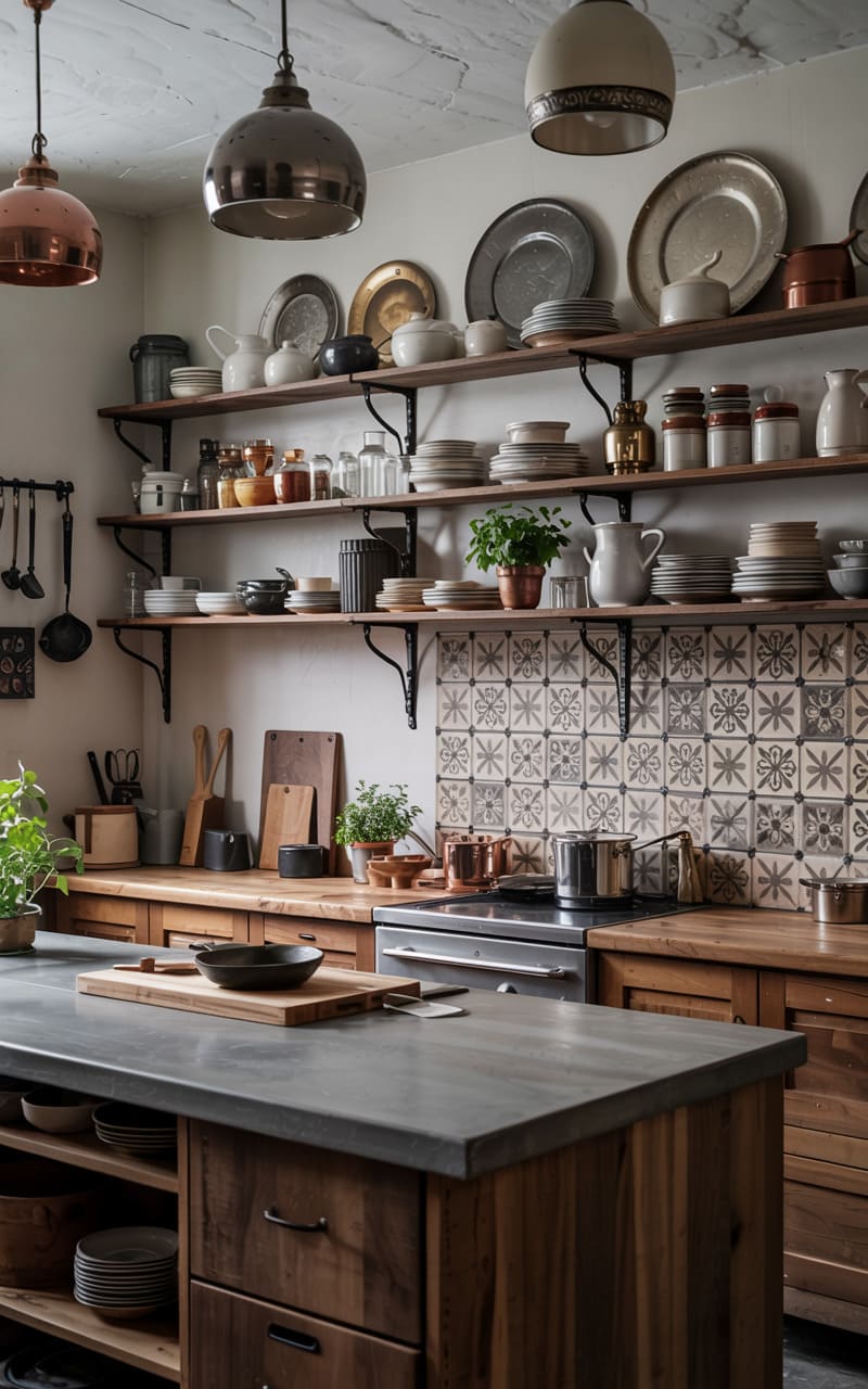 182. Industrial Kitchen with Open Shelving, Patterned Tile Backsplash, and Collected Ceramics